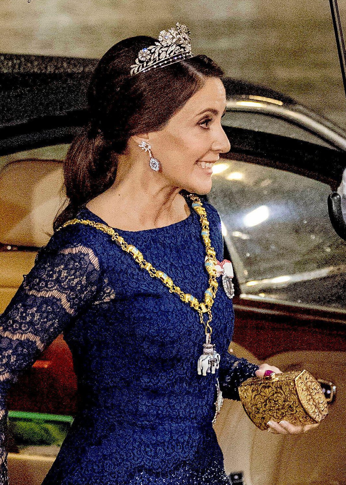 She accessorized with Princess Dagmar’s Floral Tiara and a pair of diamond earrings.