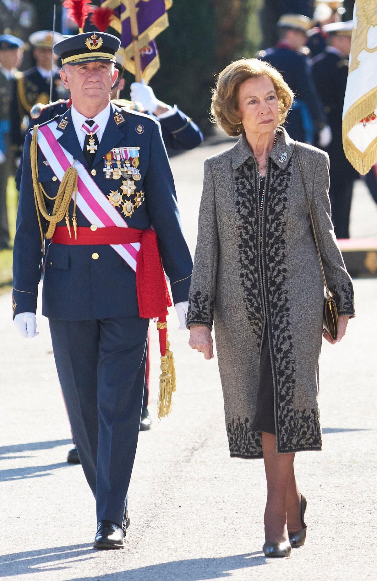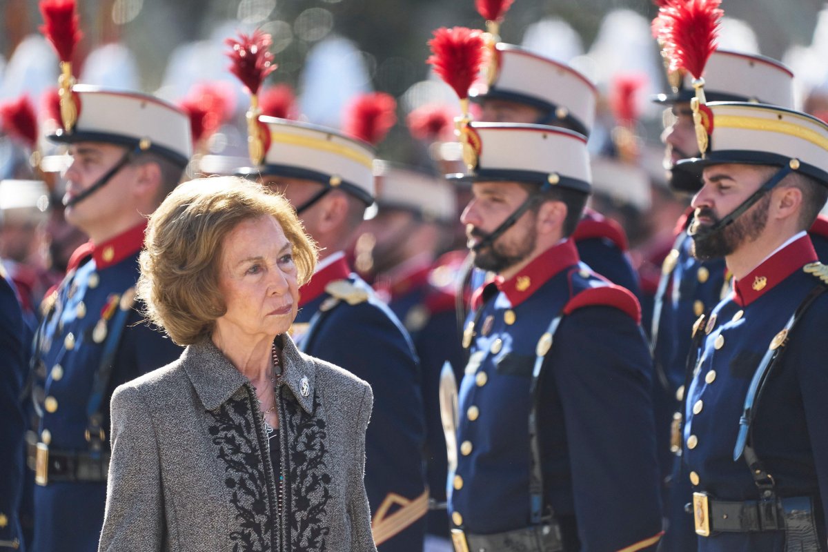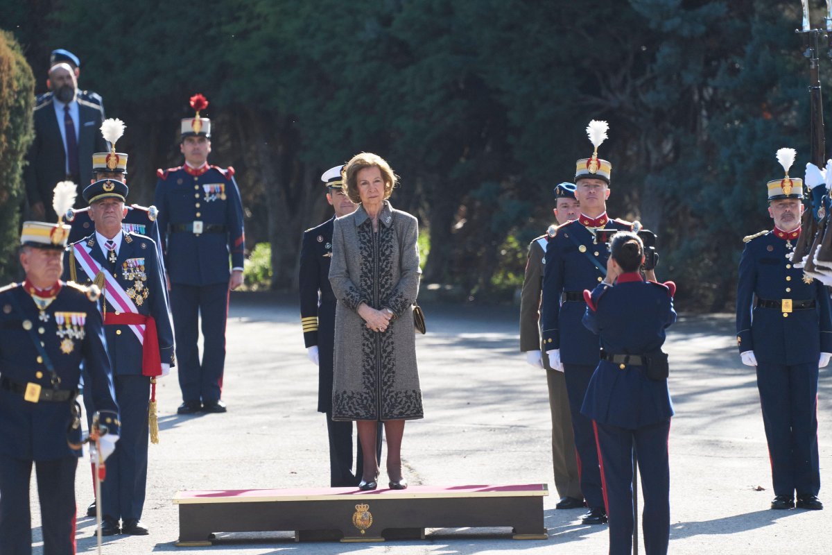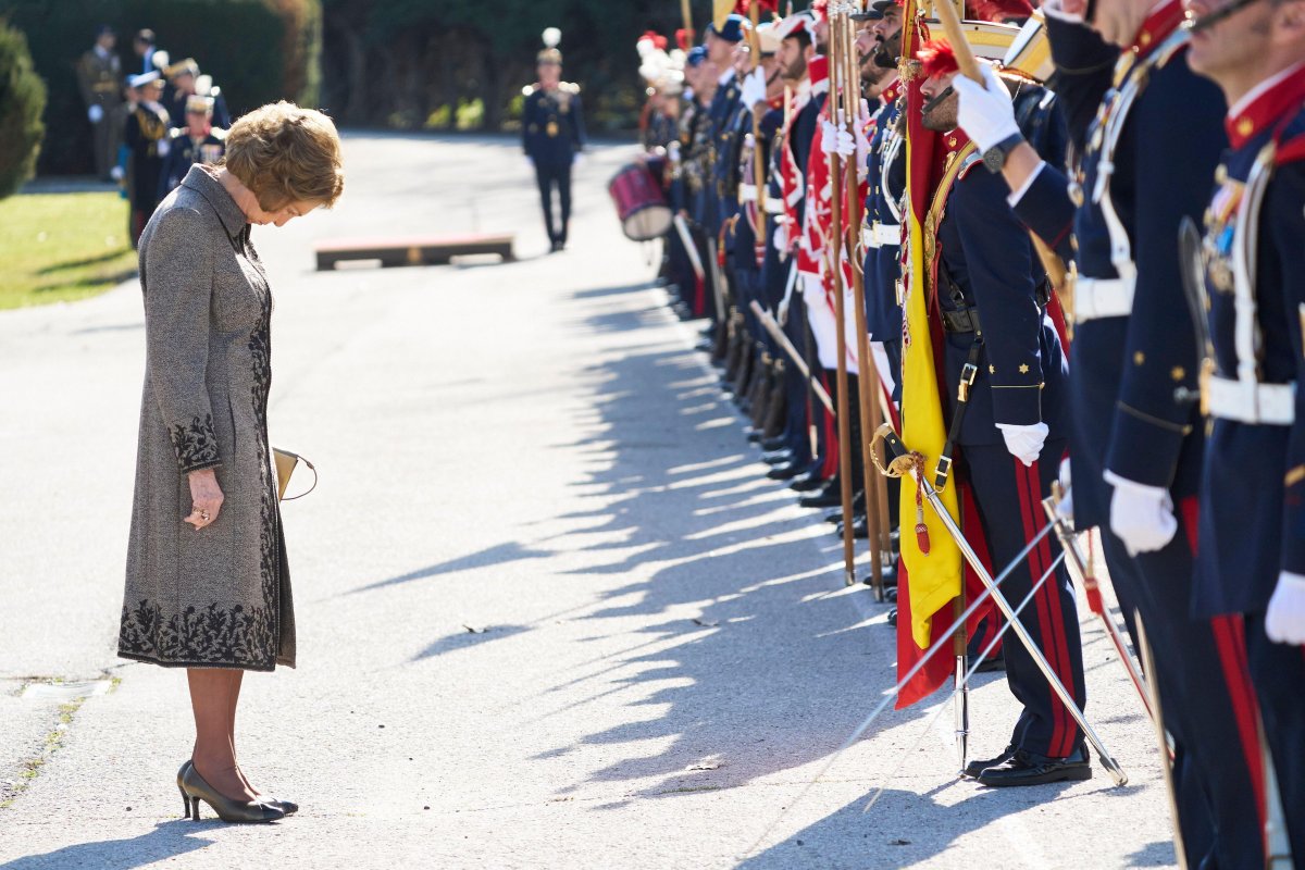 Queen Sofia of Spain, mother of King Felipe VI, headed to the King’s Barracks in El Pardo on Friday, honoring the Spanish flag alongside the soldiers of the Royal Guard.