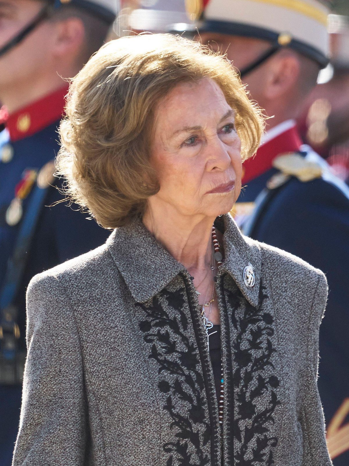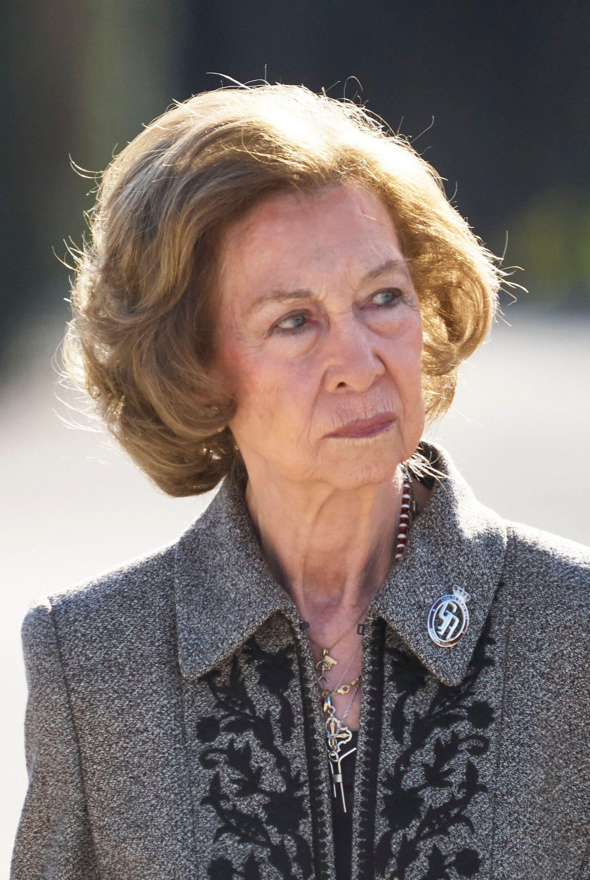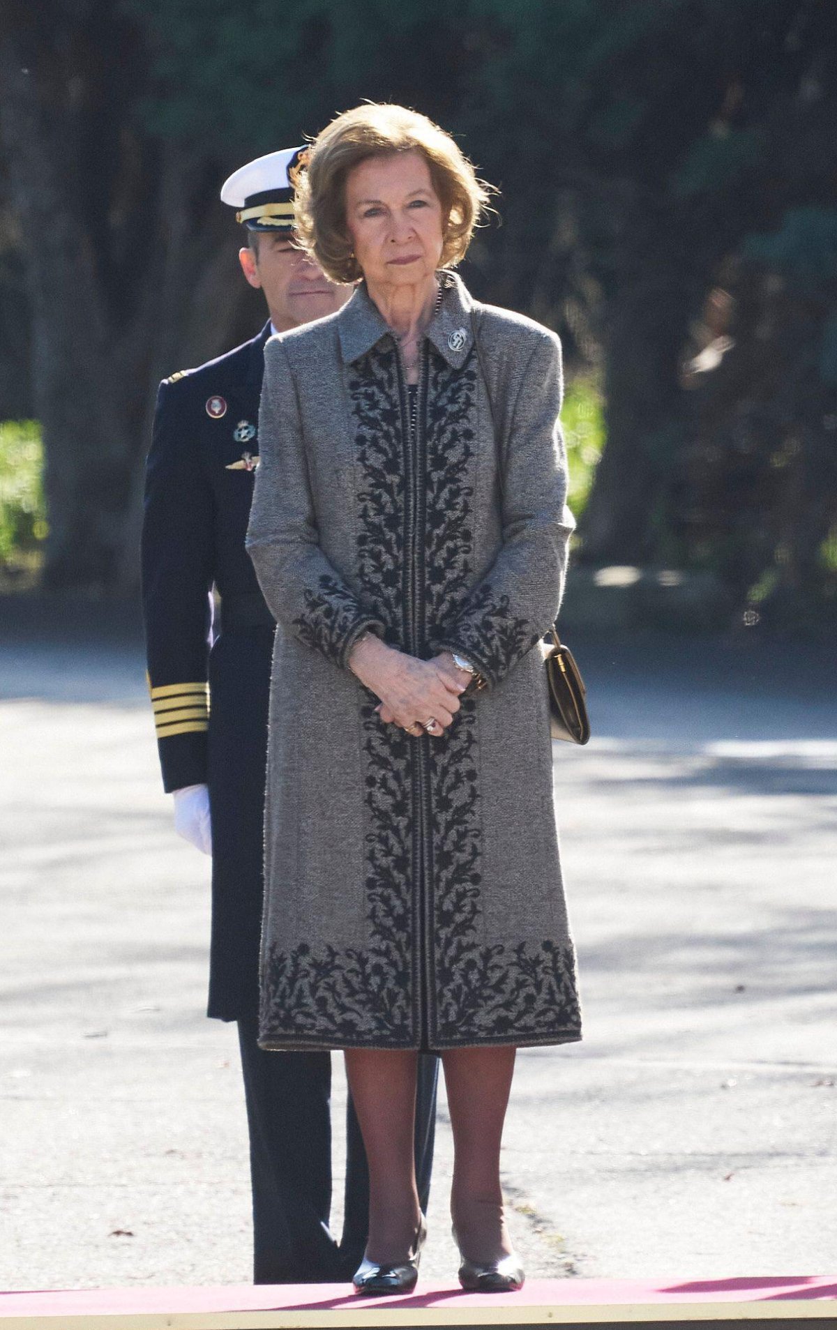 For the occasion, Queen Sofia was elegant in black and gray, including a beautiful coat with floral applique work.