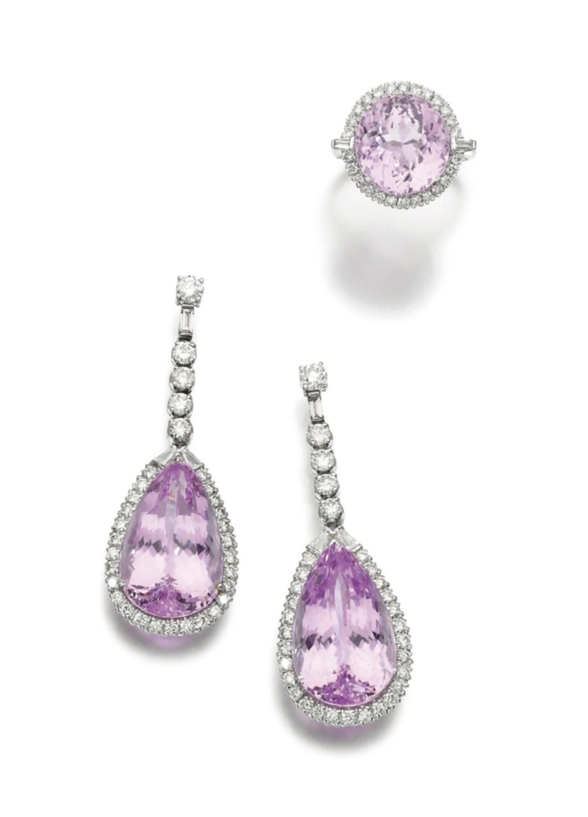 The jewels weren’t really new, though—they were just new-to-her. On June 6, 2018, the earrings and ring were auctioned by Sotheby’s in London as part of one of their Fine Jewels sales. The jewels were lot number 324 in the auction. The lot notes explained that each earring was “set with a pear-shaped kunzite framed by brilliant-cut and tapered baguette diamonds, suspended from a line of brilliant-cut and baguette diamonds,” while the ring featured “an oval kunzite, framed by brilliant-cut and tapered baguette diamonds.”