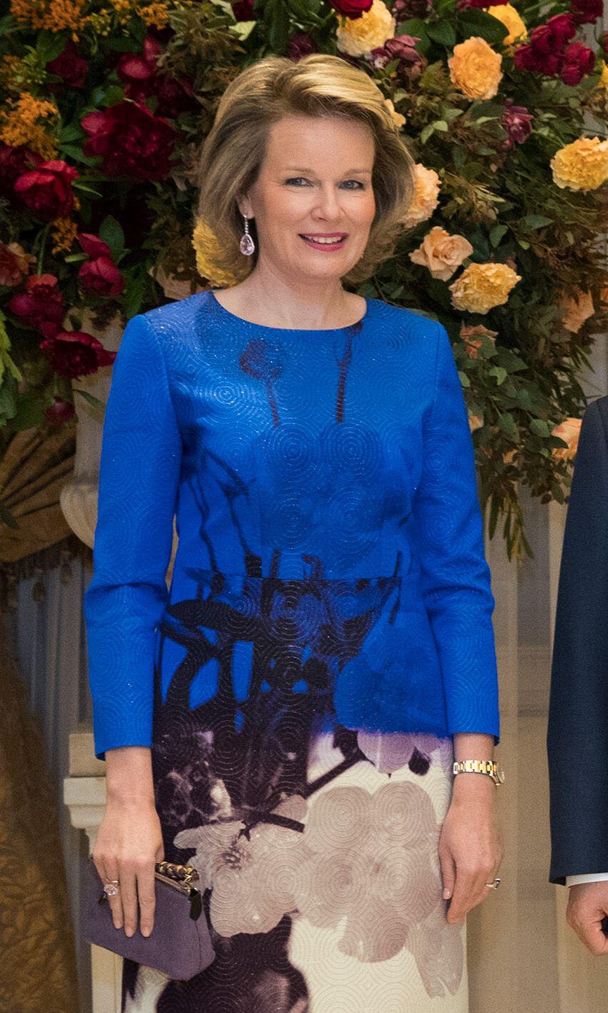Queen Mathilde wore the ring and earrings again for an official reception in Seoul during the Belgian state visit to South Korea in March 2019. The set coordinated with one of the soft purple accent colors on her dress.