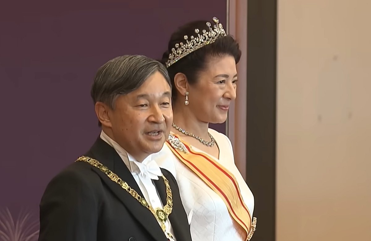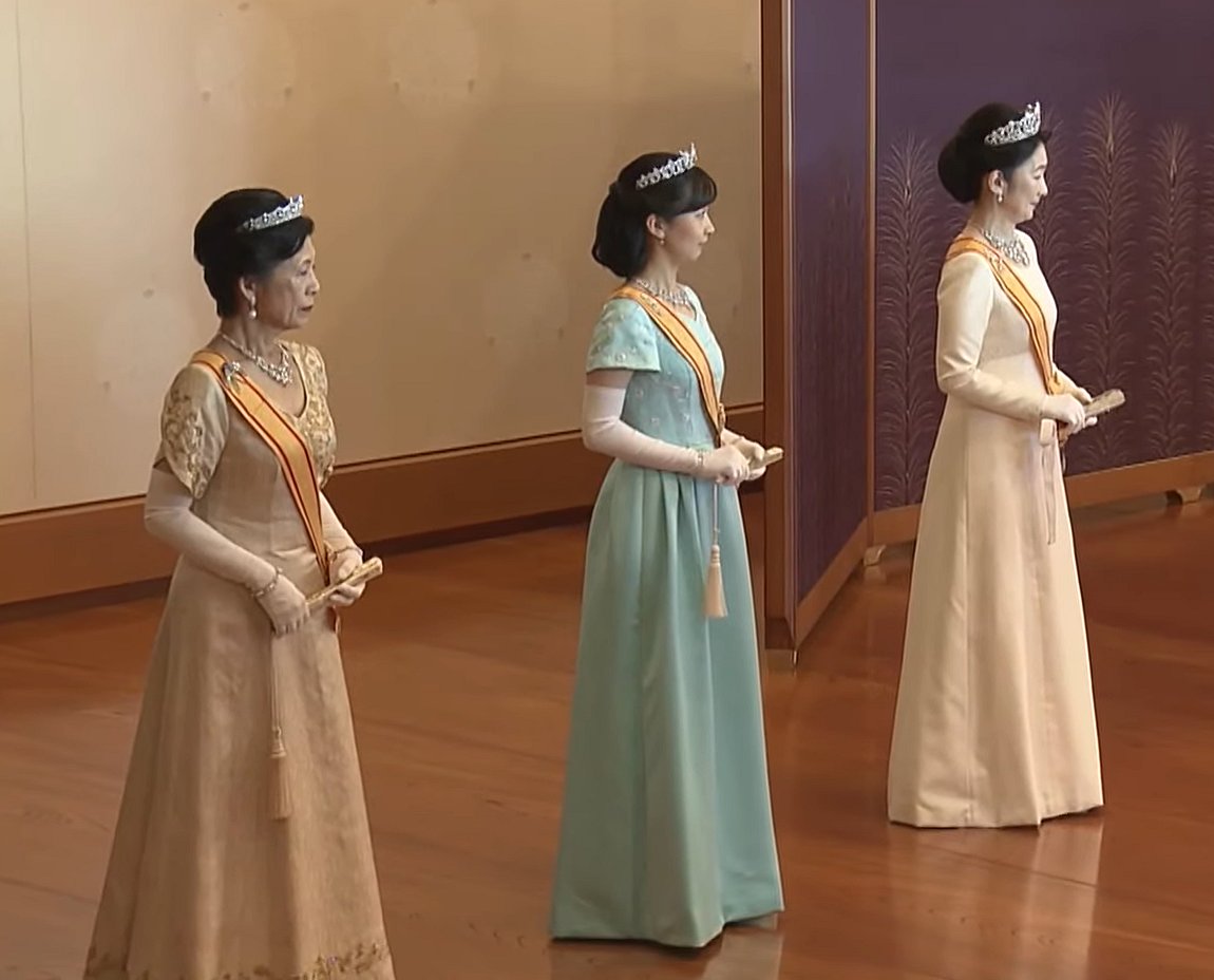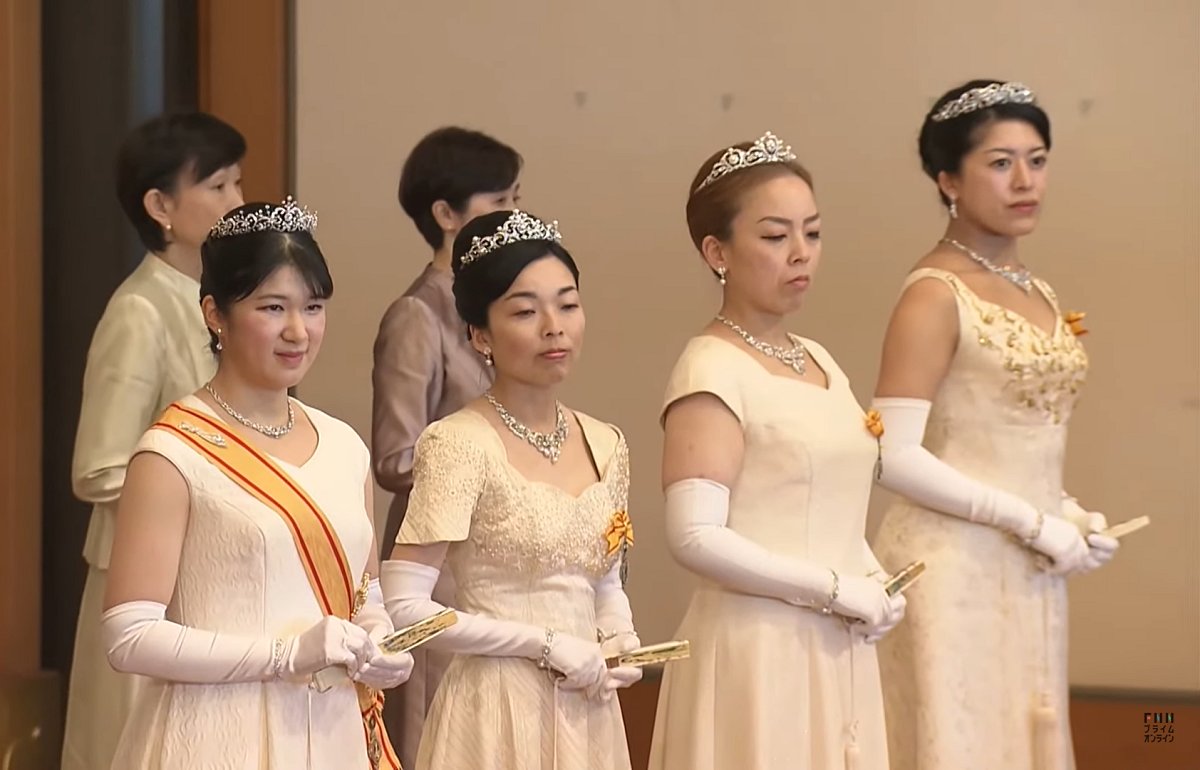 On the Empress’s left, Princess Aiko stood beside Princess Akiko of Mikasa, Princess Yoko of Mikasa, and Princess Tsuguko of Takamado. All four of the princesses wore the diamond parures that they received on their 20th birthdays.