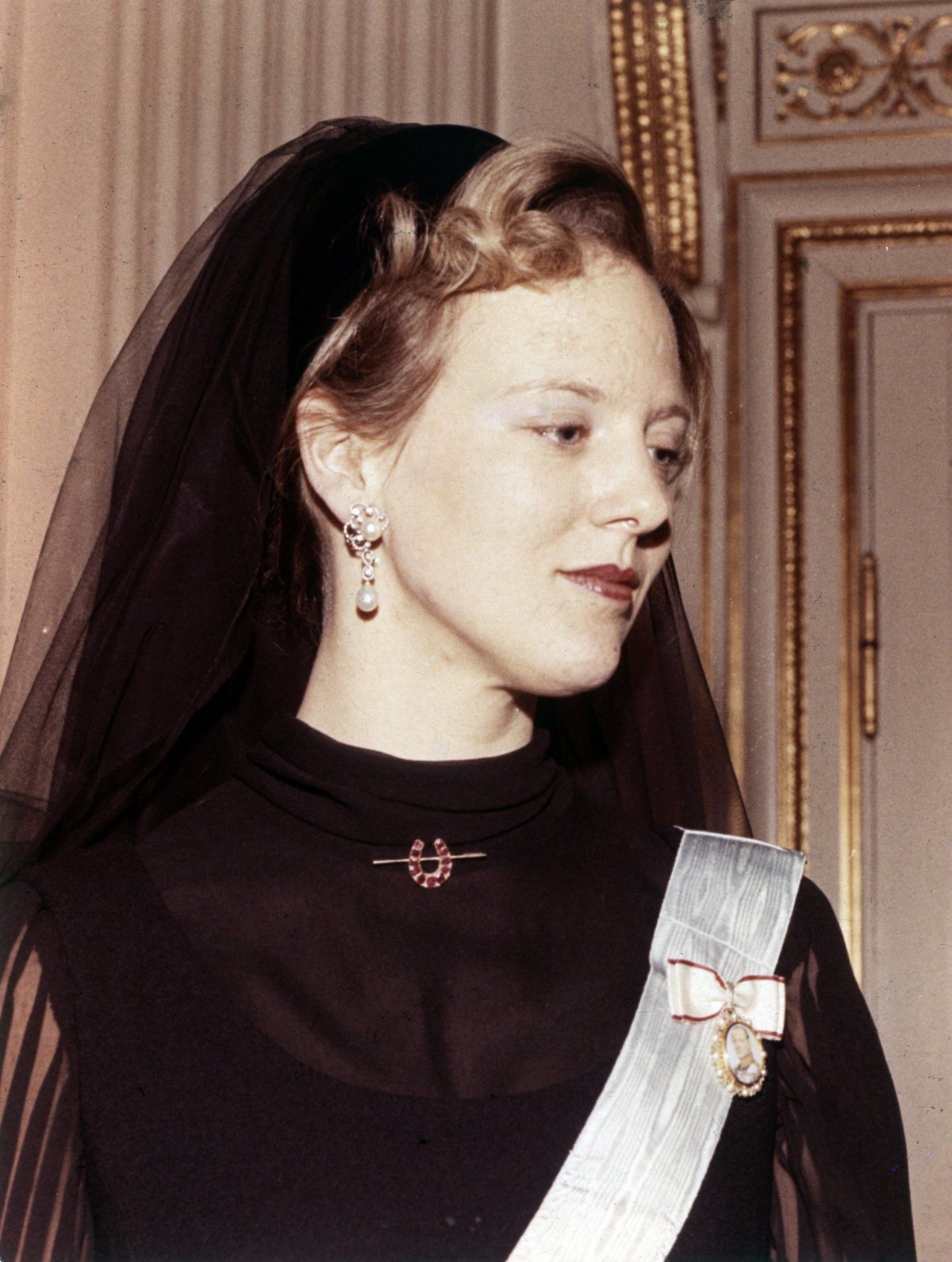 King Frederik IX died on the evening of January 14, 1972. The following morning, for her proclamation as monarch, Margrethe wore the horseshoe brooch prominently, pairing it with the diamond and pearl earrings gifted to her by her husband as a wedding present five years earlier.