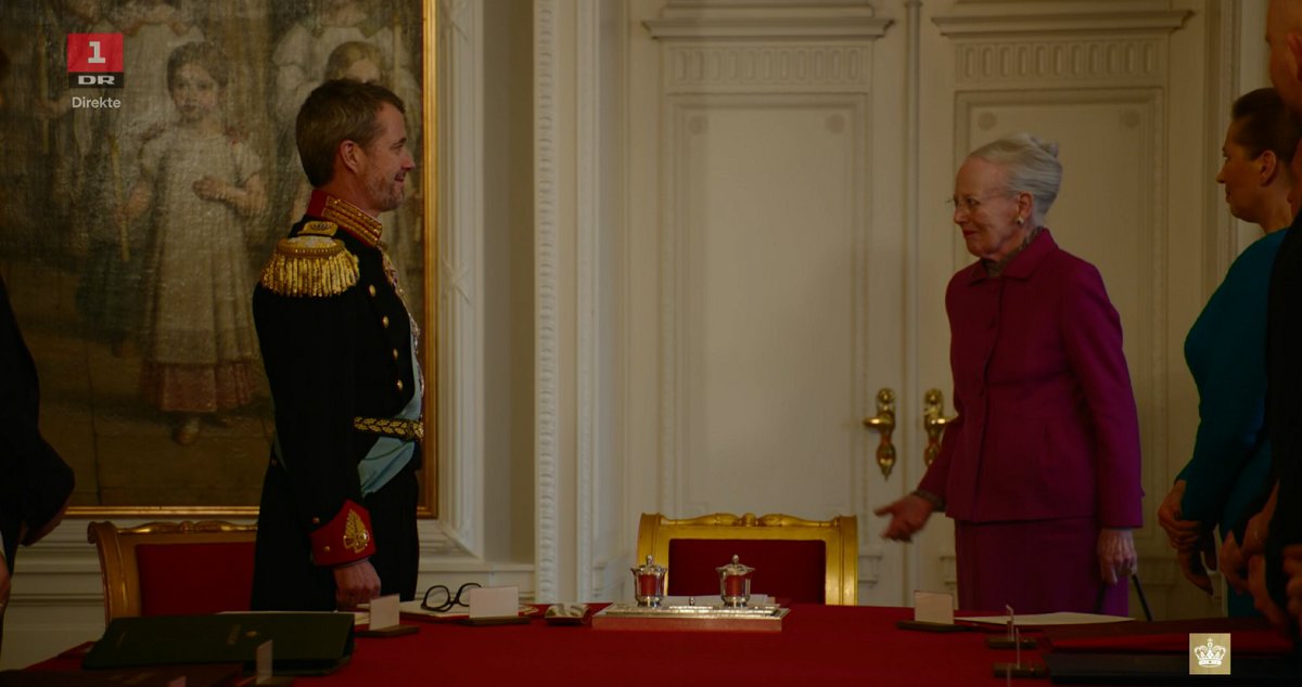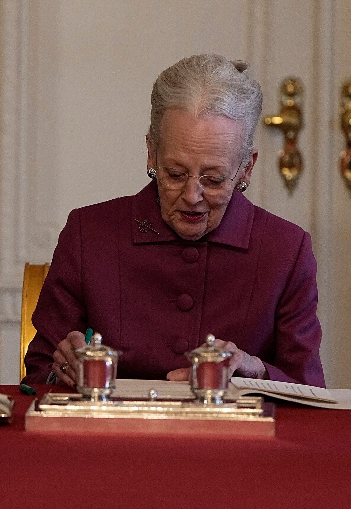 The ceremony took place almost 52 years to the day after Margrethe presided over her first Council of State meeting as monarch. She had succeeded to the Danish throne the previous evening on the death of her father, King Frederik IX, at a Copenhagen hospital.