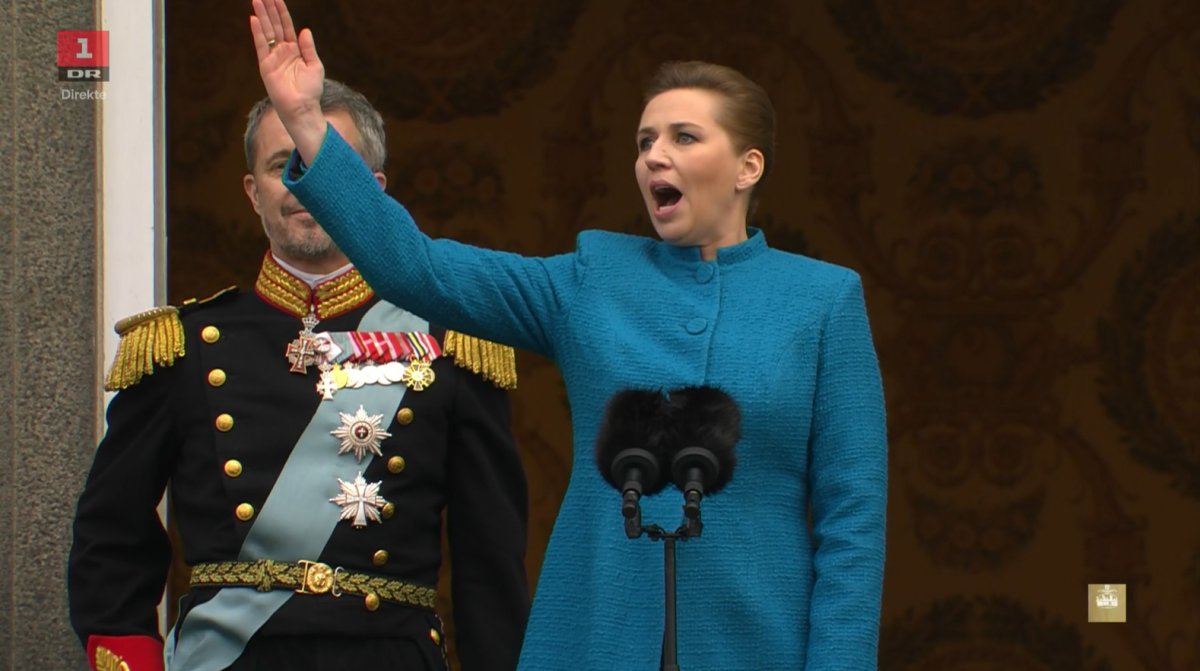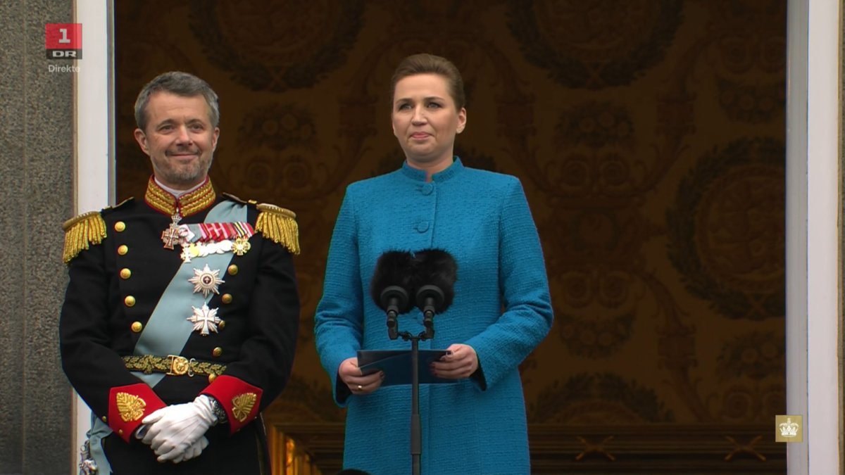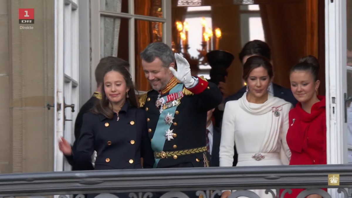 Prime Minister Mette Frederiksen joined King Frederik X on the balcony for the ceremony.