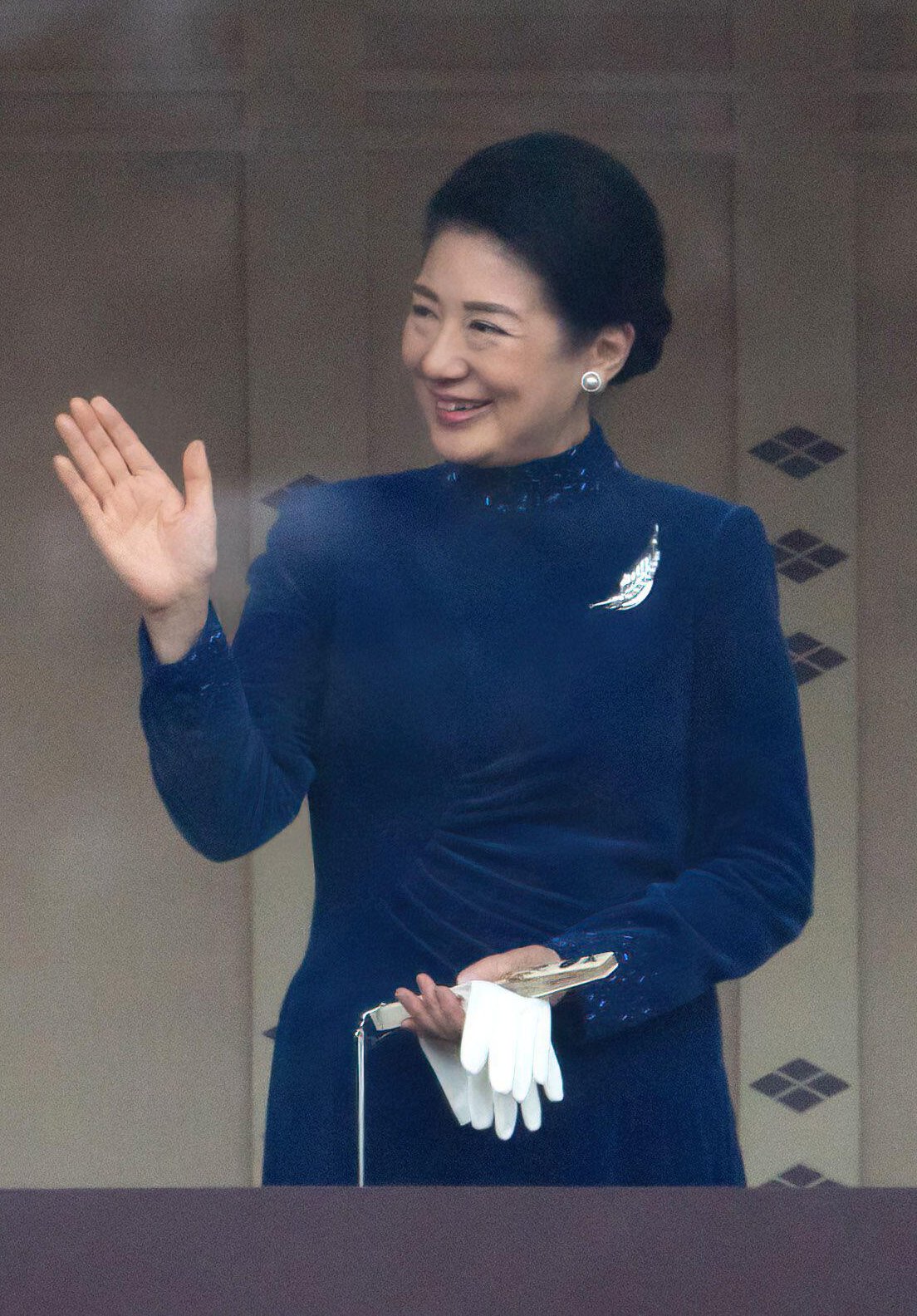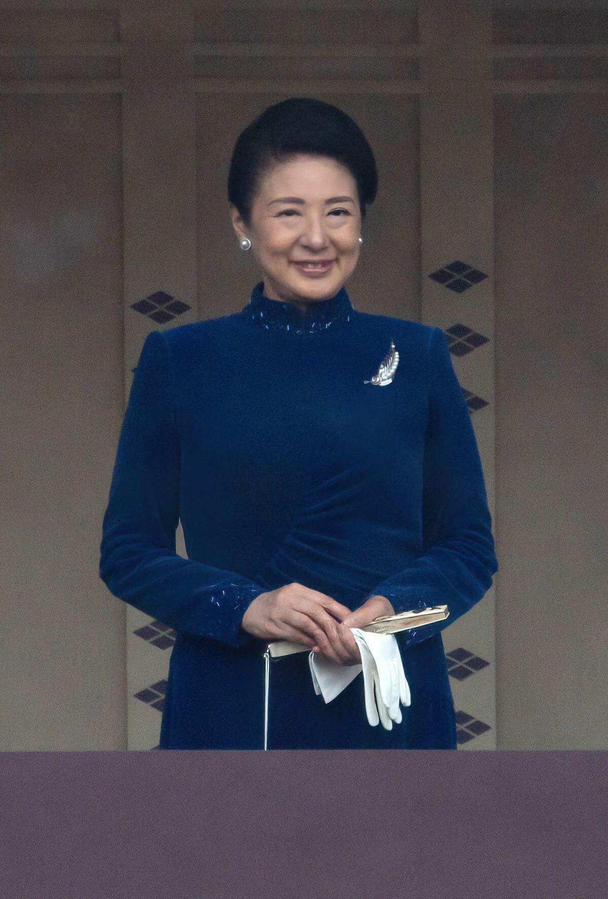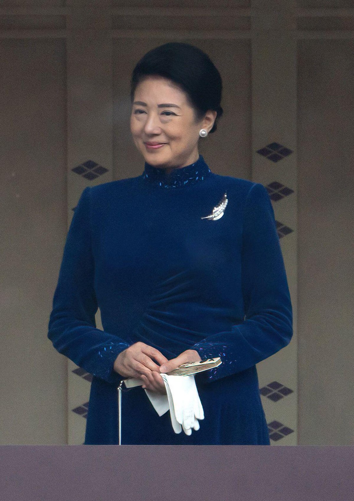 Empress Masako was elegant in navy blue velvet for Friday’s appearance, wearing a dress with gathered detailing and beads on the neckline and cuffs. The dress has been in her collection for several years.