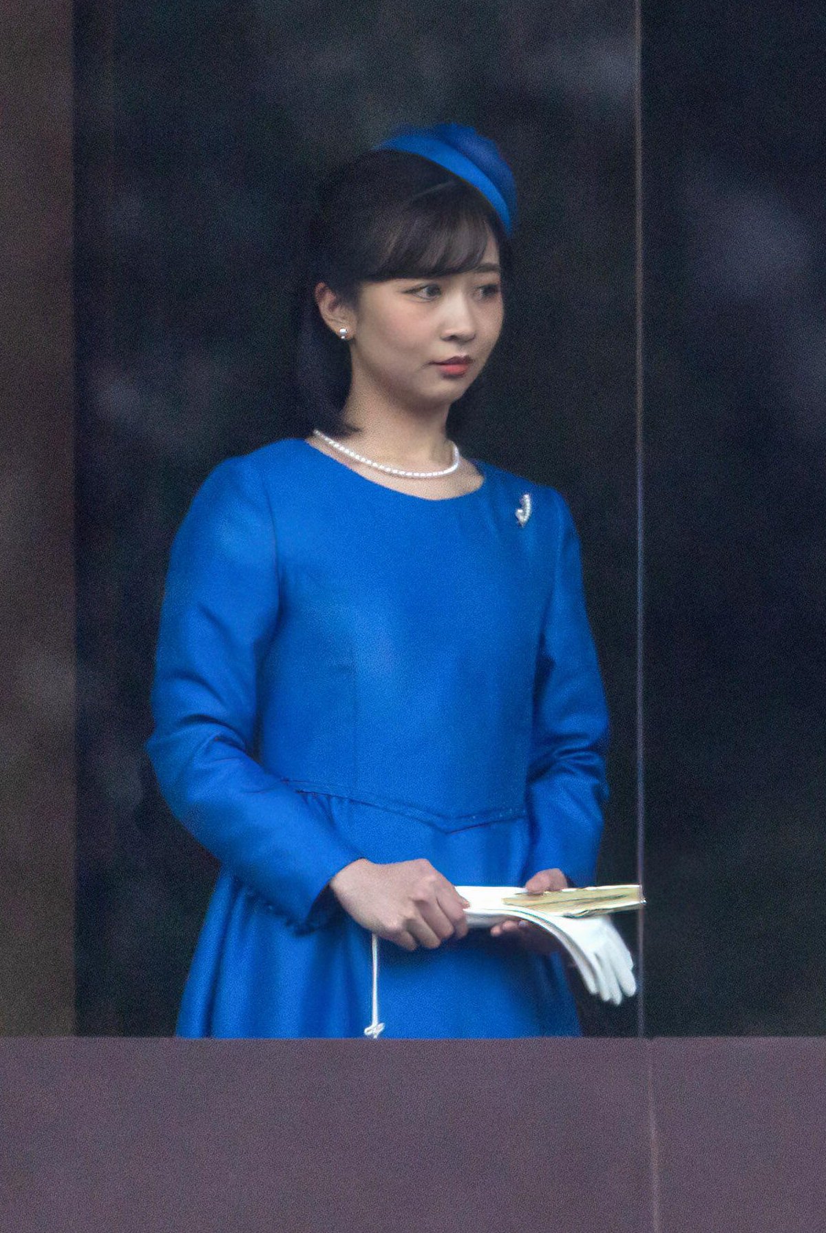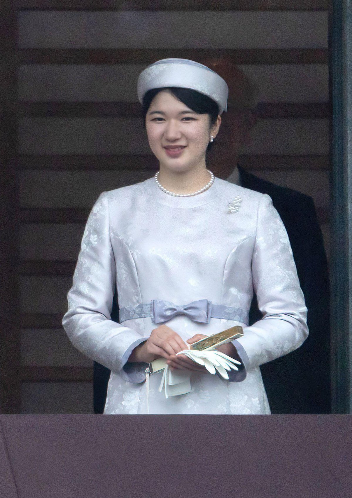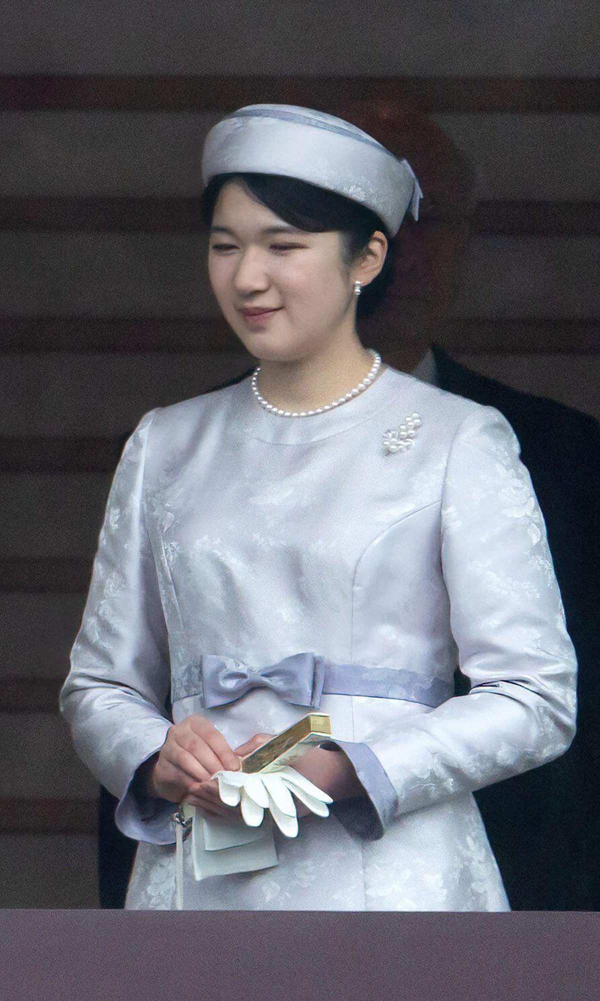 The Emperor and Empress’s daughter, Princess Aiko, joined her parents on the balcony. She wore a light blue gown with a subtle floral print and darker blue accents at the waist and cuffs, plus a hat made from the same fabric.