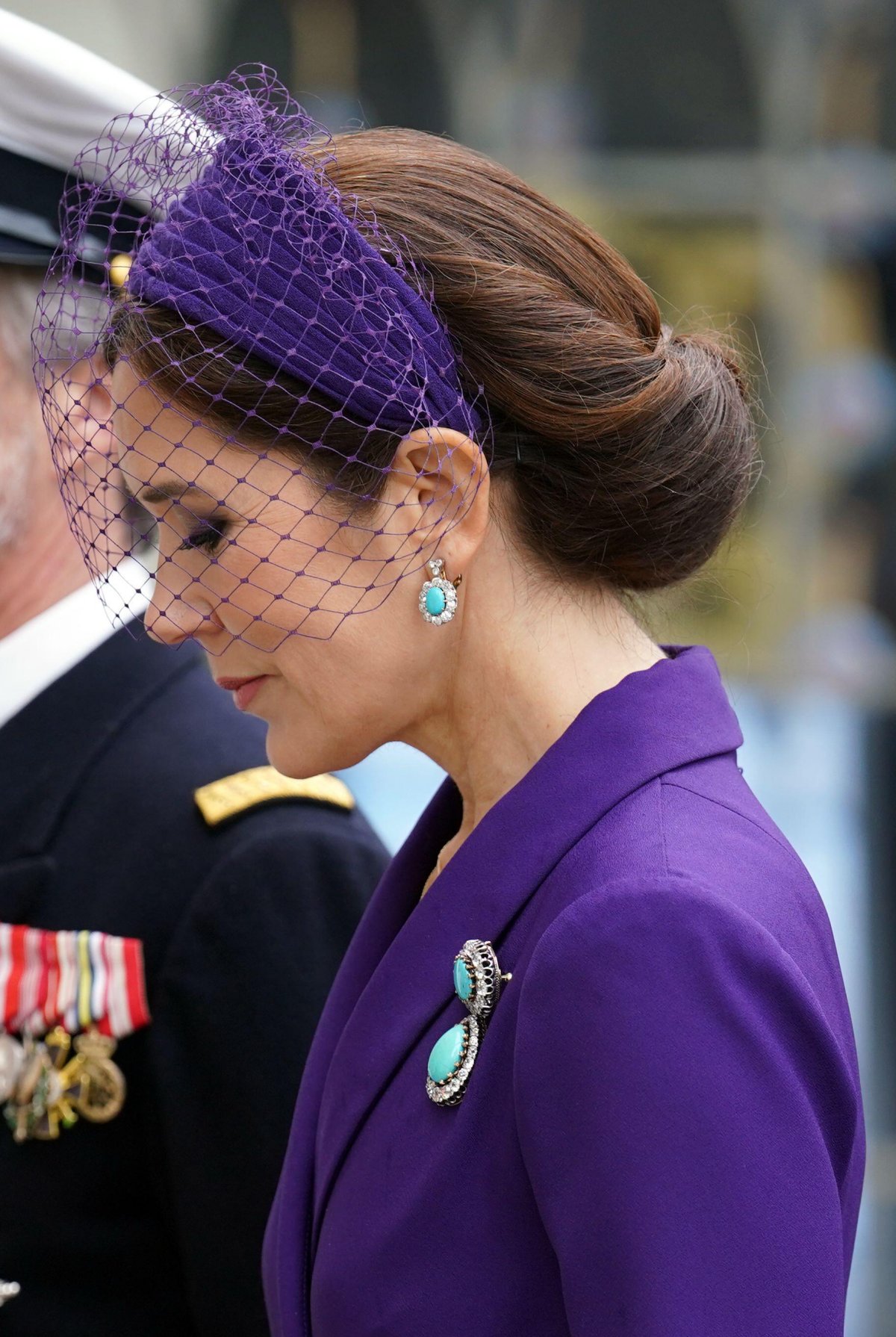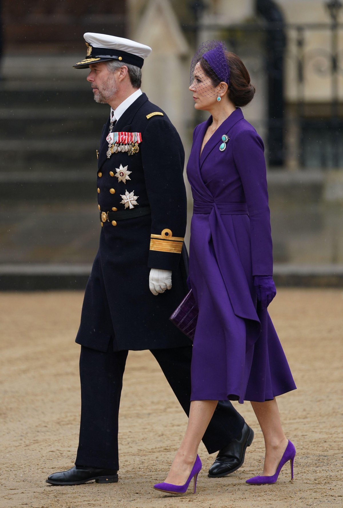 Regardless, Frederik and Mary looked exceptionally regal as they arrived at the Abbey for the coronation. Mary wore a tailored coat dress with a matching headpiece, shoes, and gloves, all in a deep shade of royal blue-purple.