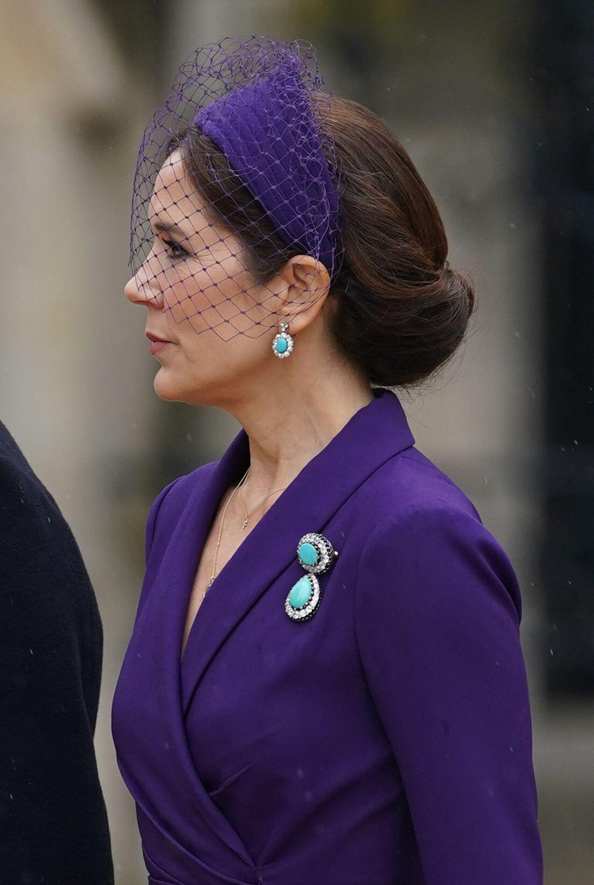 For the 2023 coronation, Crown Princess Mary kept things simple. She wore the diamond and turquoise cluster drops suspended from small diamond studs. And she let the large turquoises sing by pairing the oval cluster brooch with the large, pear-shaped cluster pendant.