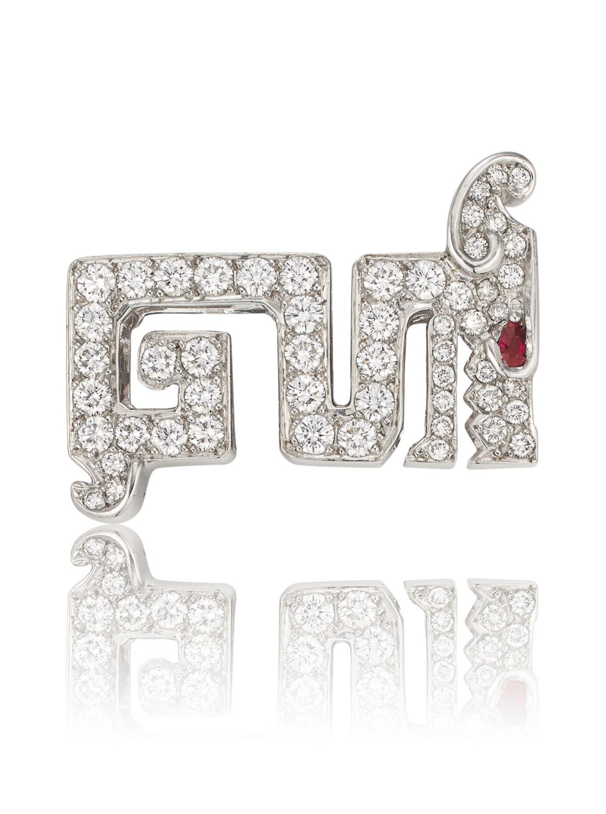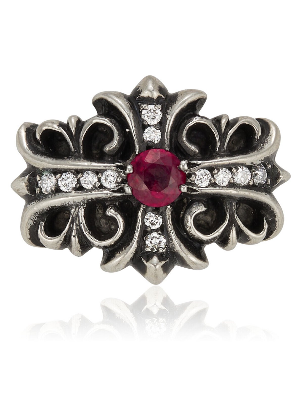 The jewelry auction also includes this unique modern jewelry piece from a Los Angeles brand, Chrome Hearts. Founded in the ’90s in Hollywood, the brand is led by designer and motorcycle enthusiast Richard Stark, and I think you can see that biker aesthetic influence on this piece. The heavy silver brooch, which is set with diamonds and a central ruby, was made in 1997. Its auction estimate is set at between $1,000-1,500 USD.