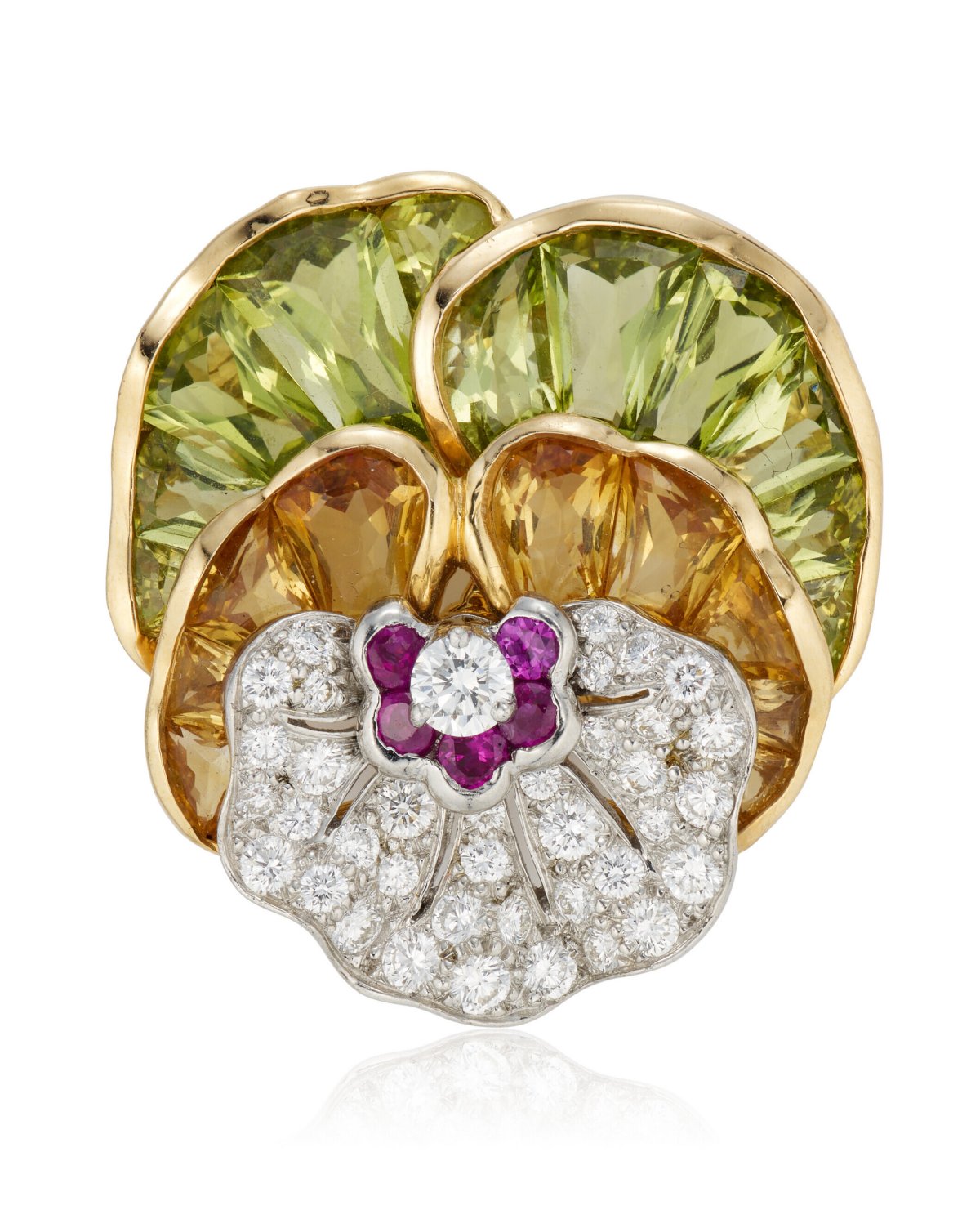Queen Camilla’s jewelry box also includes a lovely pair of jeweled pansy brooches. Sir Elton is selling a similar one at Christie’s, made by Oscar Heyman & Brothers, a wholesale jewelry firm that makes pieces for the retail market. They’ve produced similar pansy brooches for Tiffany & Co., but the notes from Christie’s are silent on that possible connection. The notes do clarify that the brooch is made of yellow gold and platinum and set with diamonds, rubies, peridots, and citrines. They estimate that it will bring between $6,000-8,000 USD.
