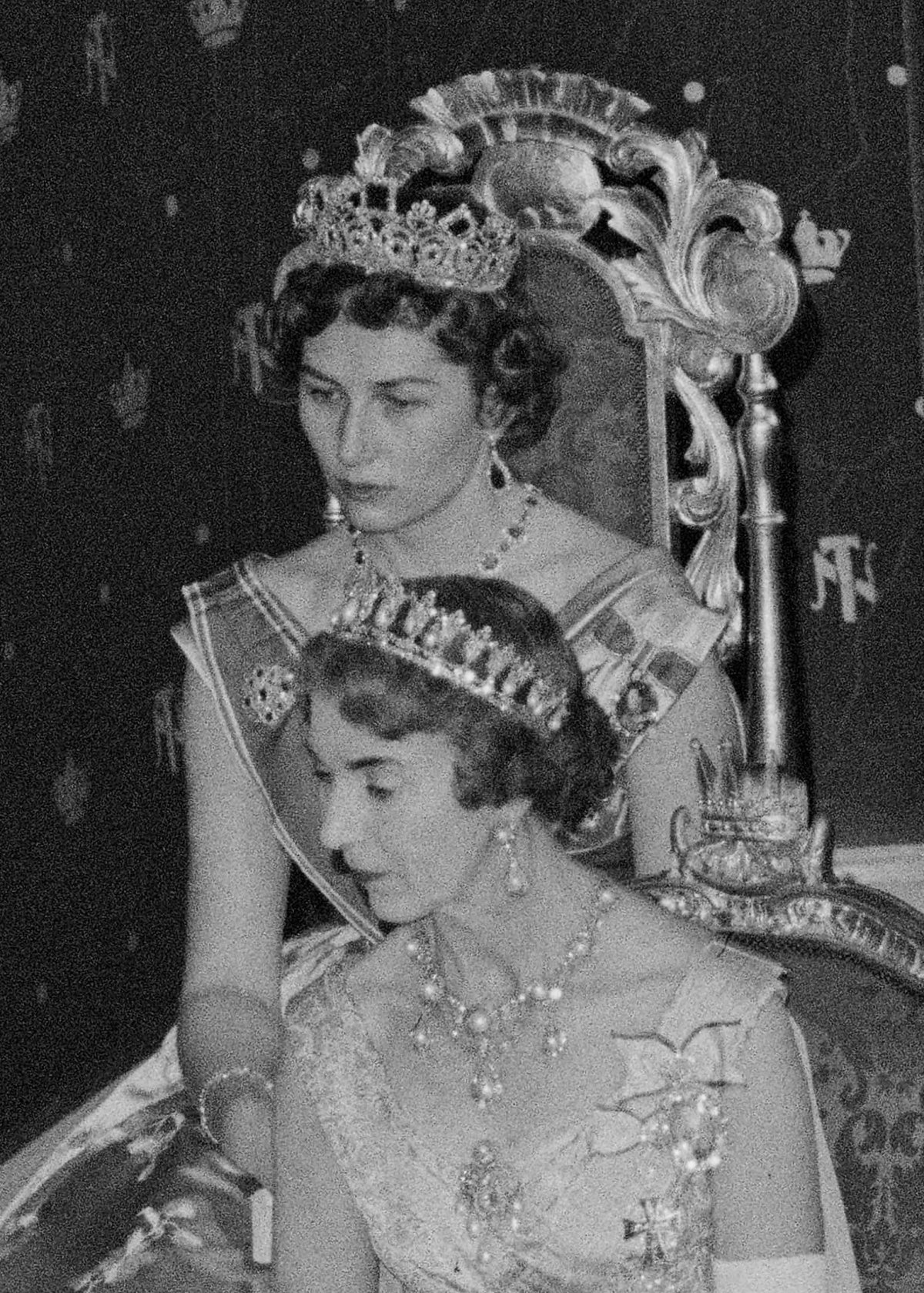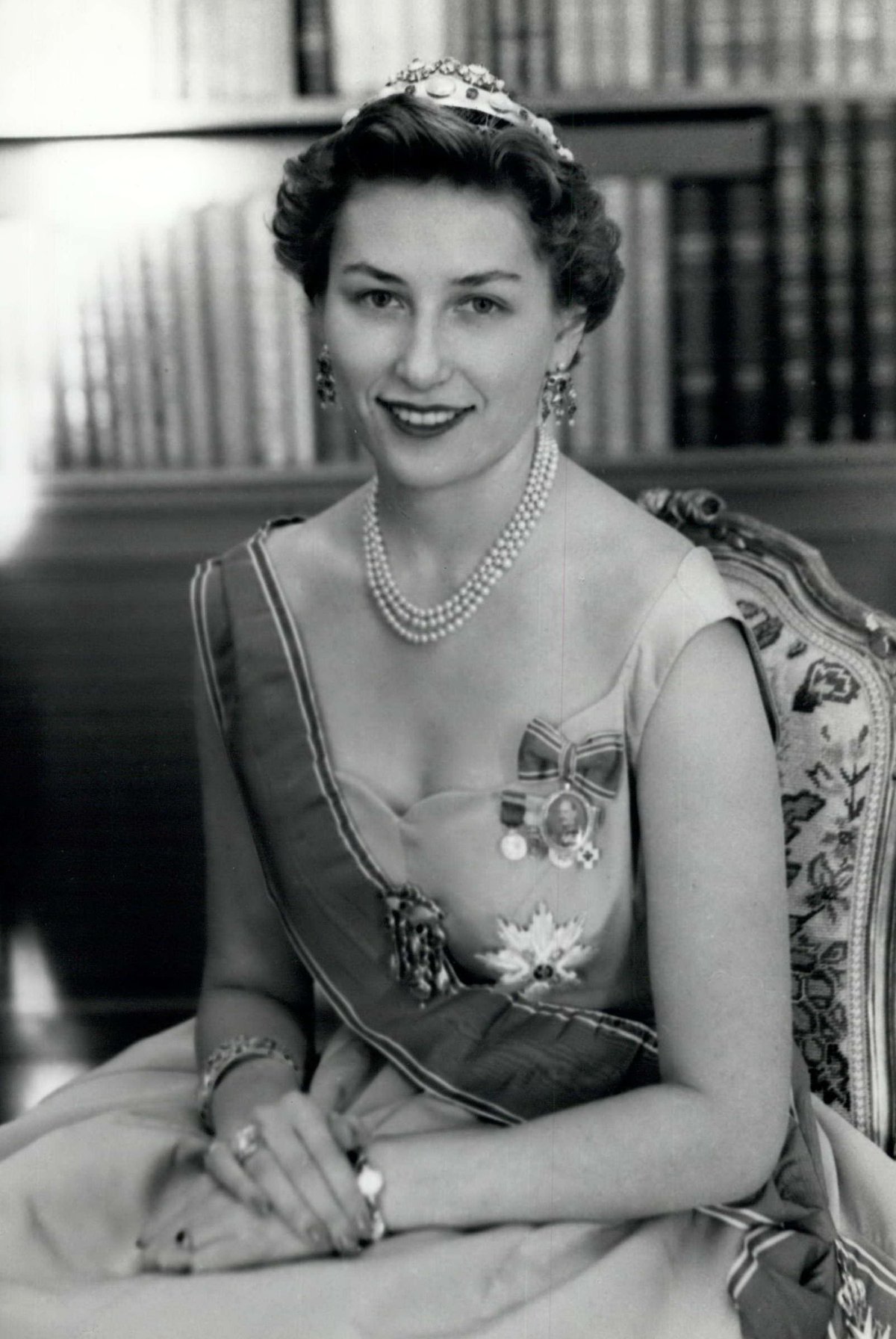 (Also, P.S.: Queen Ingrid, sitting in front of Princess Astrid here, is wearing the Pearl Poiré Tiara and jewels from the coordinating married parure.)