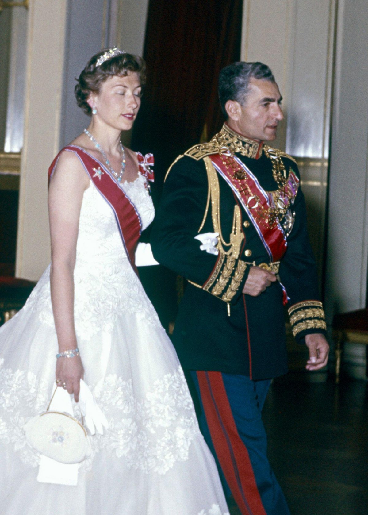 Here, just a few months after her wedding, Princess Astrid arrives for a state banquet at the Royal Palace in Oslo on the arm of the guest of honor, the visiting Shah of Iran. She’s wearing her wedding gown (without its lace bodice and sleeves overlay) for the occasion, paired with a special tiara inherited from her mother. This is the Vasa Tiara, Crown Princess Märtha’s 1929 wedding gift from the people of her native Stockholm. The tiara has been in Astrid’s collection for decades, but she has told Trond Norén Isaksen that she intends to have it returned to the Norwegian royal vaults after her death.
