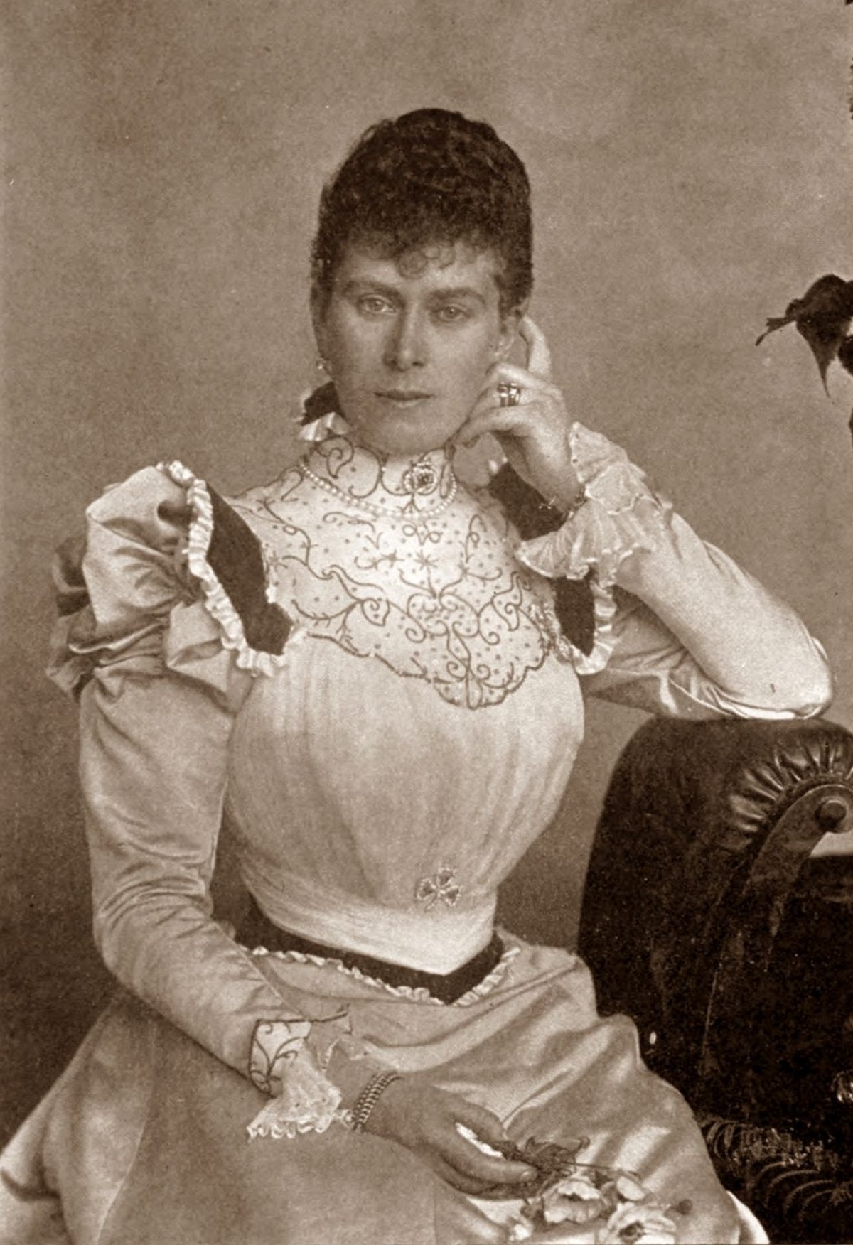 Mary wore the brooch often in the early years of her marriage. In this portrait, taken while she was Duchess of York, she wears the shamrock brooch pinned at her waist. There’s also another emerald and diamond brooch pinned at her neck in this photograph. That’s likely the emerald and diamond knot brooch given to her by the future Emperor Nicholas II of Russia. The knot brooch is now worn by Queen Camilla.