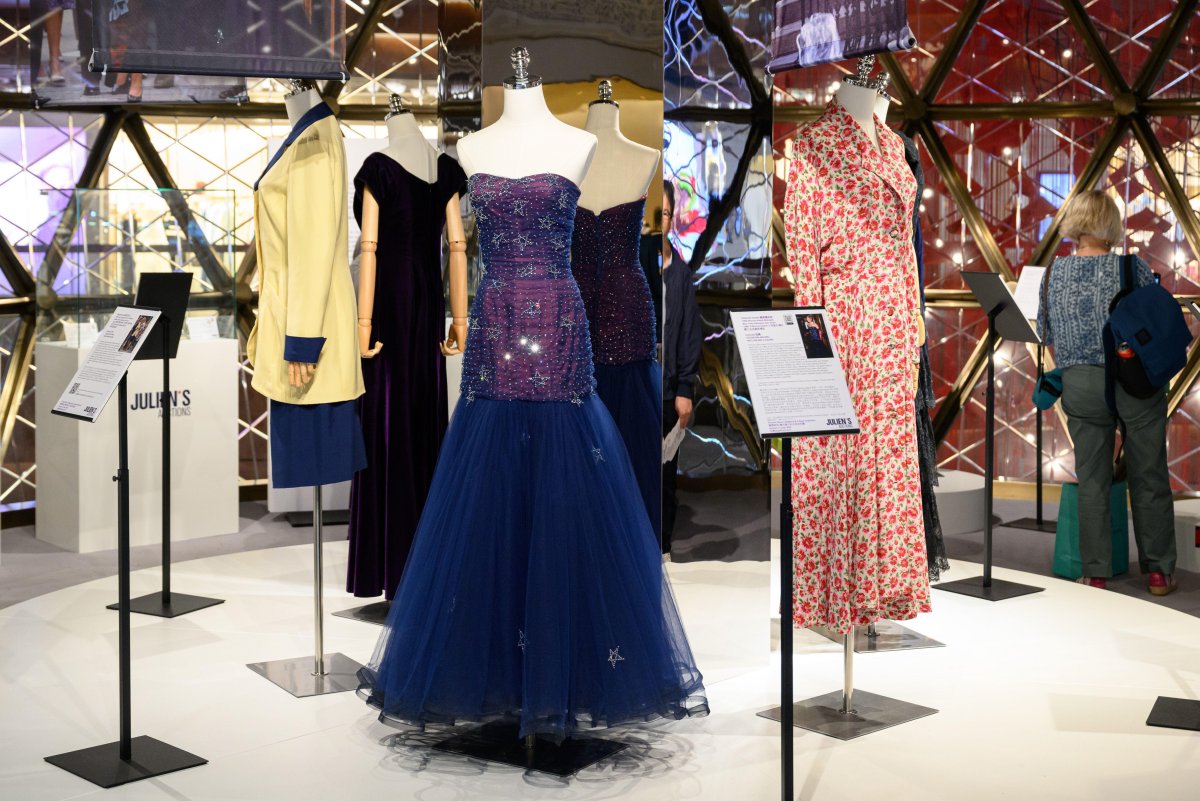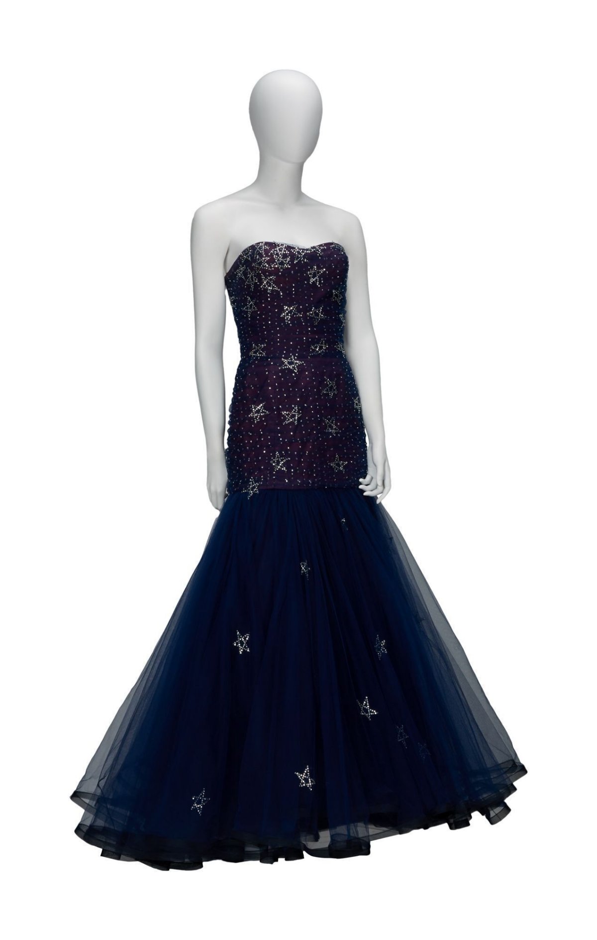 The gown, made of midnight blue silk tulle, features a strapless neckline and a dropped waist. It is decorated with silver diamanté stars on the bodice and the ballerina-length skirt. The designer used deep purple silk tulle layers to add extra depth to the dress. The gown was purchased at Christie’s in London in June 1997 for $48,300 by Pat Kerr Tigrett, a bridal designer from Memphis, Tennessee. She later loaned it to Kensington Palace for the Diana: Her Fashion Story exhibition from 2017-2019. Now, Julian’s is selling the dress with an estimate of $200,000-$400,000.