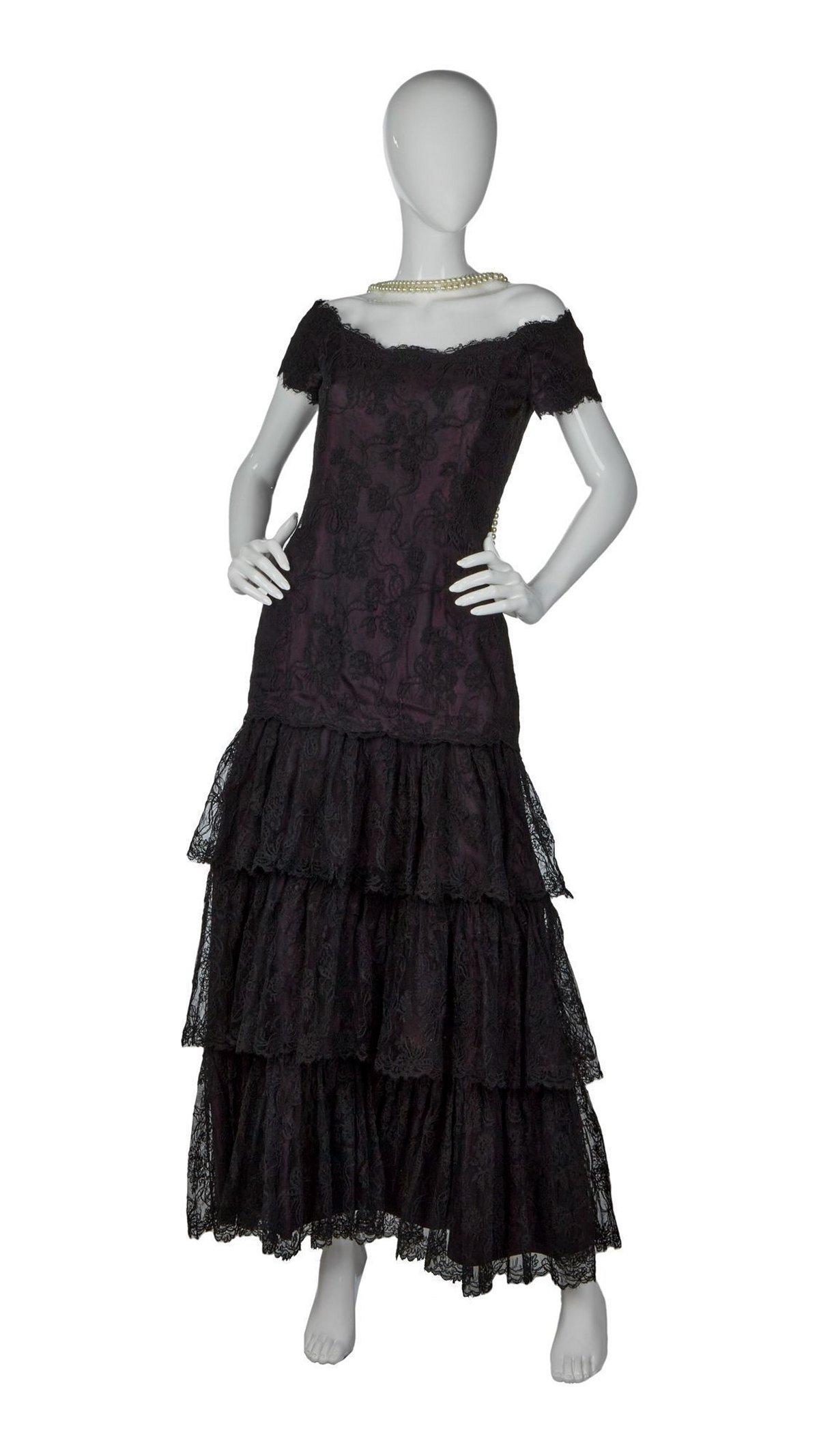 Also dating to the second half of the 1980s is this Spanish-inspired evening dress, made by Victor Edelstein for his fall 1986 collection. Diana wore numerous Edelstein dresses during her life, including the famous “Travolta dress.” This evening gown is made of black lace layered over magenta silk for a bronzed effect, a custom colorway produced specifically for Diana. The Julien’s auction catalogue notes that Diana would sometimes “attend the rehearsals of the show to preview the collections where she would discuss with [Edelstein] alternative versions of the designs for her to wear.”