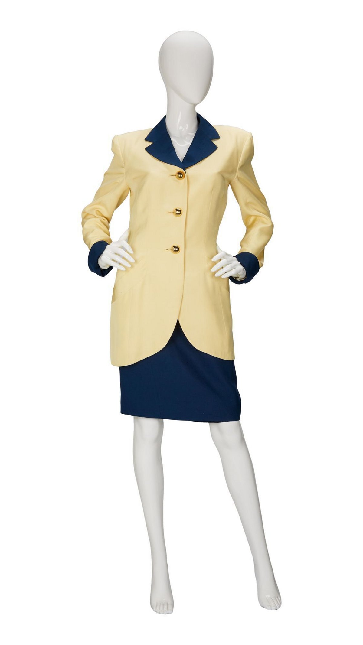 This Catherine Walker skirt and jacket are considerably more familiar. The two-piece yellow and navy skirt suit was worn by Diana on multiple occasions in the 1989-90. Julien’s has set the auction estimate for the ensemble at $30,000-$50,000.