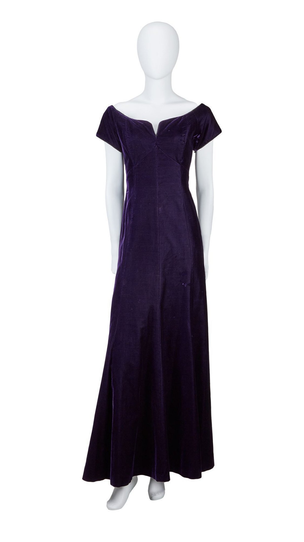 This dress, featuring a similar silhouette, was made by the designer Caroline Charles. Julien’s states that the dress is “dark purple cotton velvet evening gown belonging to Princess Diana.” The dress was not included in the 1997 Christie’s sale in London, and Diana doesn’t seem to have been photographed wearing it in public. Accordingly, the estimate is set lower for this lot: $100,000-$200,000.