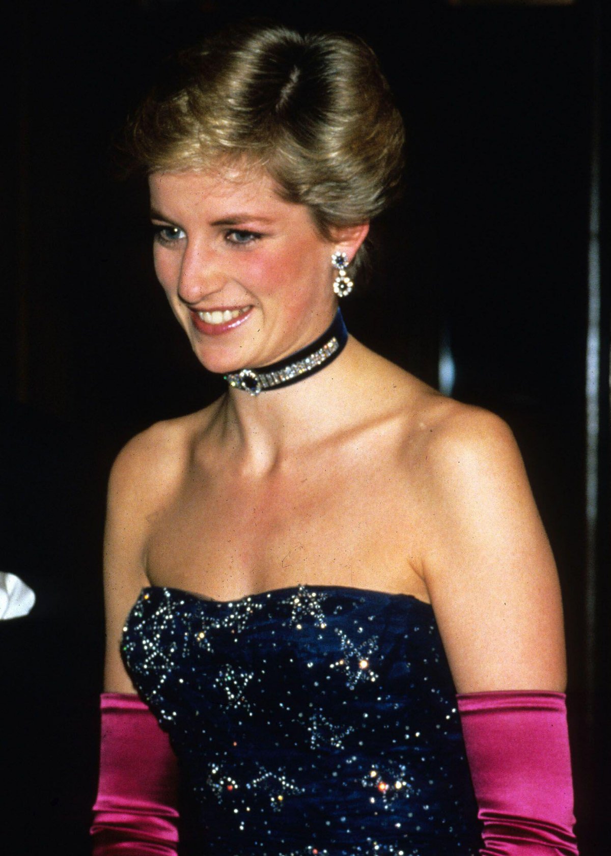 Later the same year, Diana wore the dress again, this time for a Royal Gala Performance of the musical The Phantom of the Opera in London. This time, she wore the same sapphire and diamond earrings but a different necklace. The choker features diamonds and sapphire on a blue velvet backing.