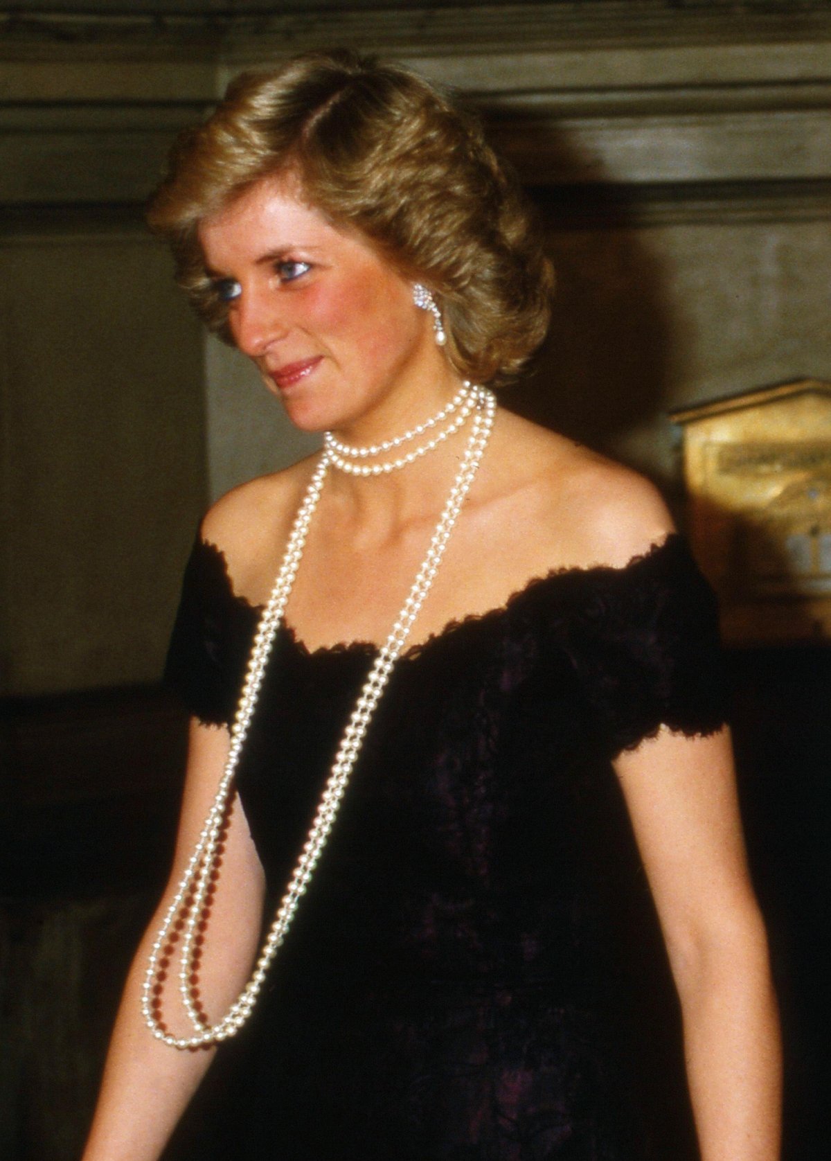 A few months later, in November 1987, Diana wore the dress for a reception during an official tour of Germany. This time, she wore another long strand of pearls (perhaps the same one) doubled up. She paired the pearls with the diamond and pearl drop earrings given to her as a wedding present by the Emir of Qatar.