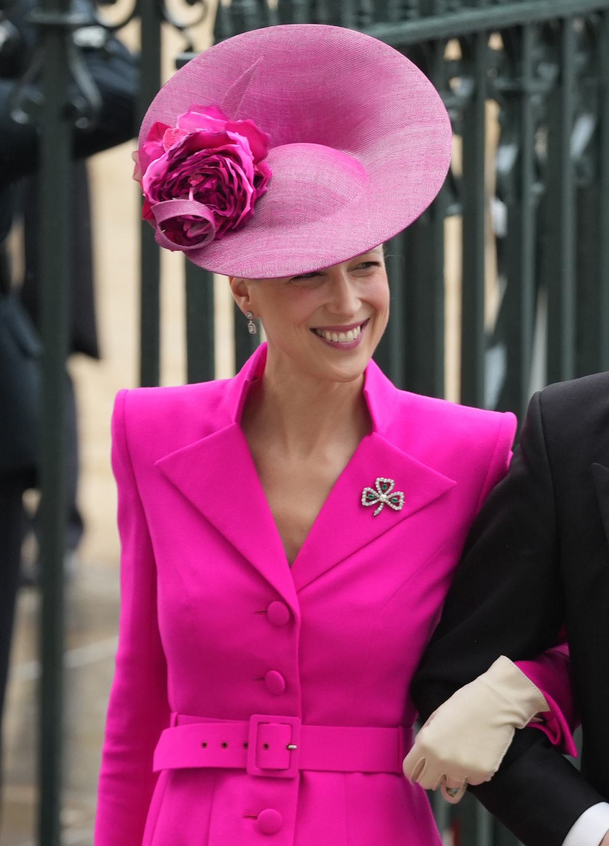 Zara wasn’t the only Windsor to wear a special brooch on Coronation Day. Lady Gabriella, daughter of Prince and Princess Michael of Kent, borrowed an heirloom royal jewel from her mother for the ceremony: Queen Mary’s Diamond and Emerald Shamrock Brooch. The brooch has now been worn by four generations of Windsor women: Queen Mary, Princess Marina, Princess Michael, and Lady Ella.