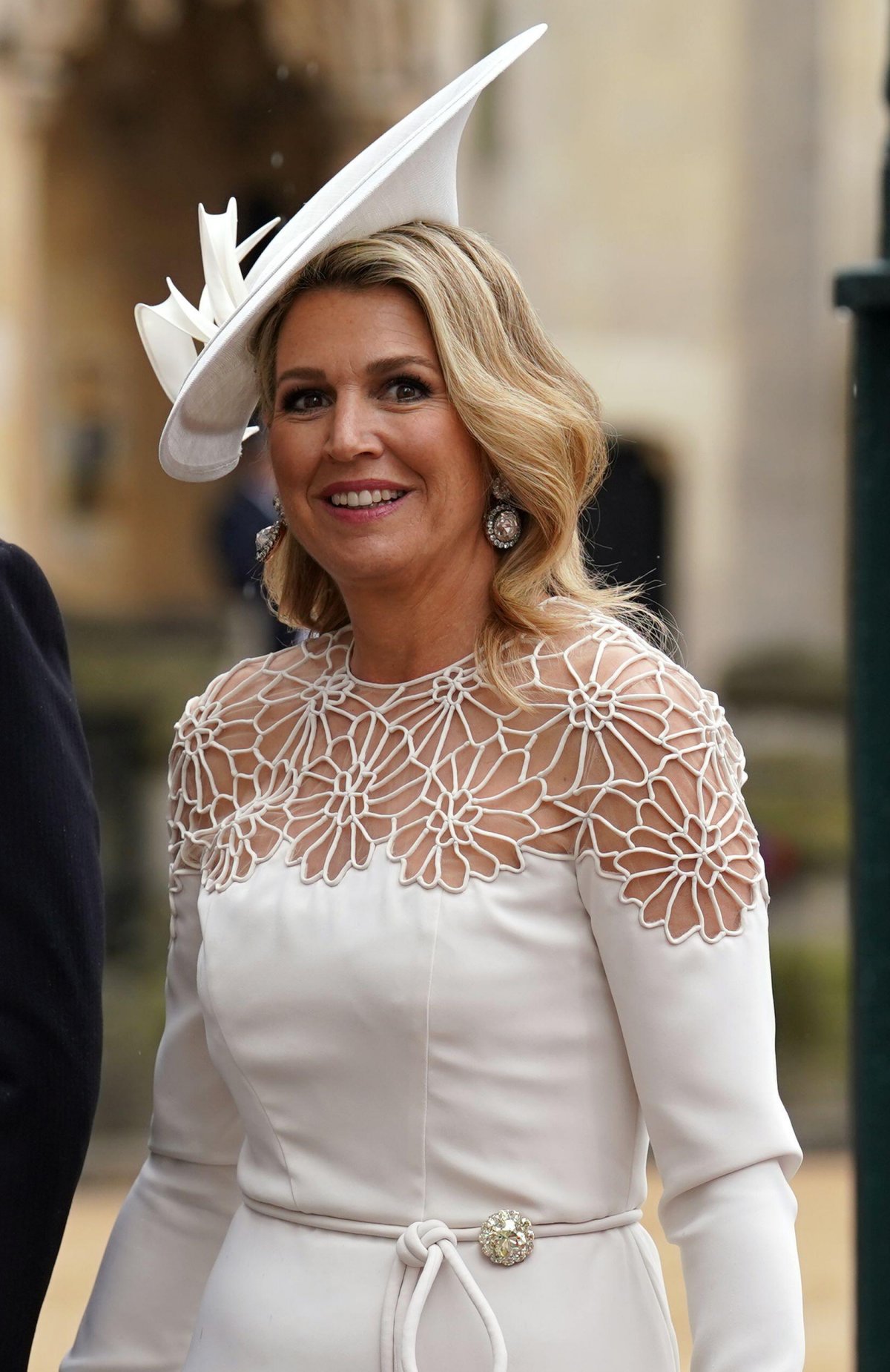 Queen Letizia wasn’t the only European royal wearing fabulous diamond earrings for the coronation. Queen Maxima of the Netherlands arrived at Westminster Abbey wearing the enormous diamond earrings made of clusters that are usually part of the grand Stuart Tiara. There’s a British connection here, too: the tiara was made to showcase the Stuart Diamond, which was bought by King William III and Queen Mary II of England and returned to his native Holland after their deaths. The brooch pinned at Maxima’s waist is also a Dutch royal treasure: it’s part of an enormous diamond stomacher gifted to Queen Emma as a wedding present in 1879.