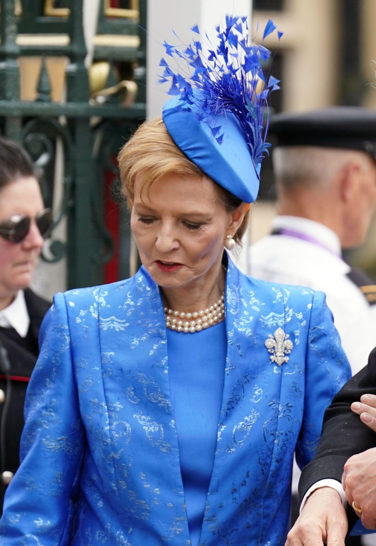 Numerous royal cousins and relatives from across Europe attended the coronation ceremony. Among them was Margareta of Romania, daughter of that country’s last king. For the ceremony, she wore a classic diamond fleur-de-lis brooch. The heirloom jewel originally belonged to Margareta’s Greek royal grandmother, Queen Helen of Romania, who was a first cousin of the late Prince Philip, Duke of Edinburgh.