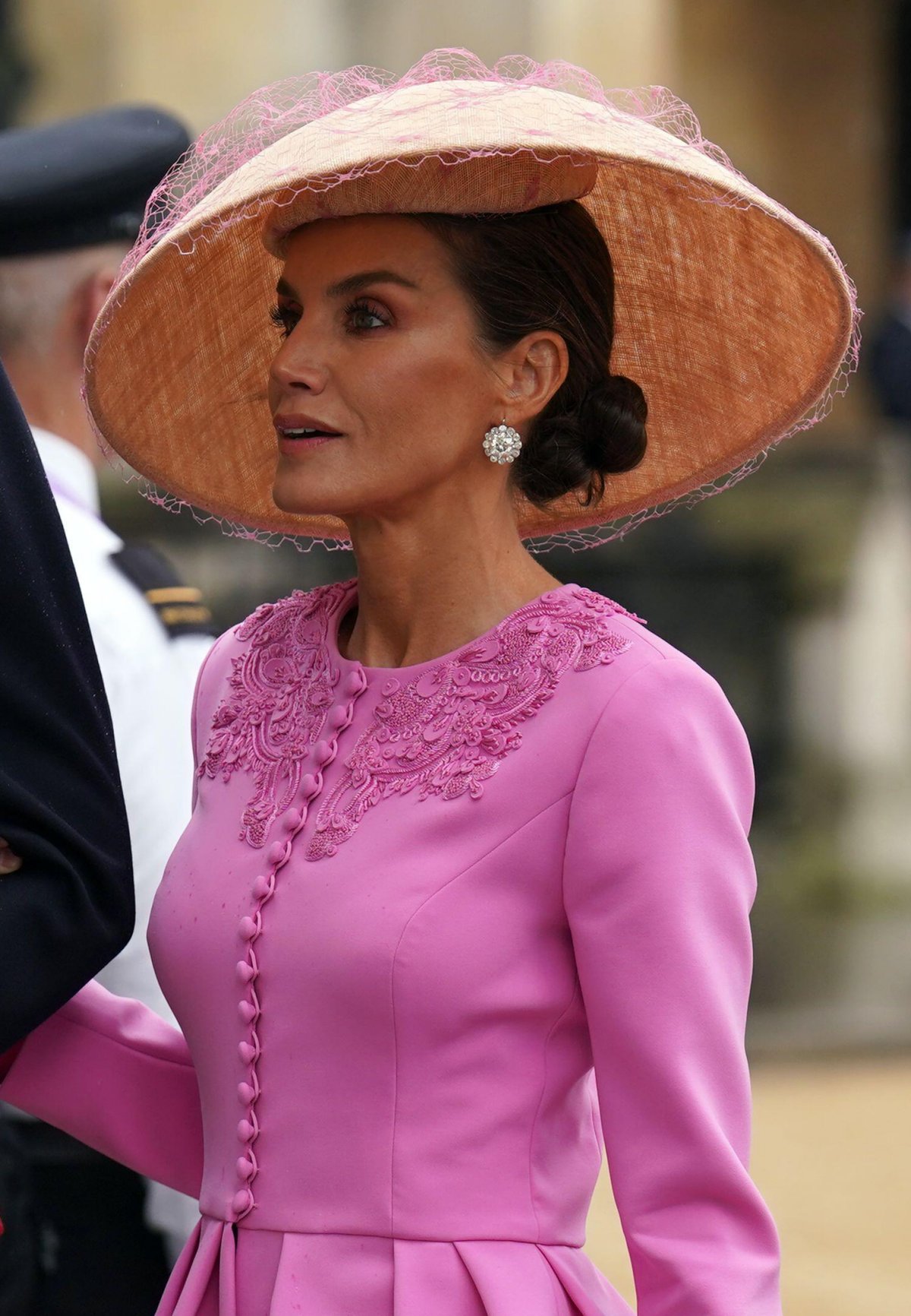 Queen Letizia of Spain arrived for the coronation ceremony wearing an impressive pair of diamond earrings. They’re part of the joyas de pasar collection, a cache of jewels that originally belonged to King Felipe VI’s great-grandmother, Queen Victoria Eugenie of Spain. Queen Victoria Eugenie was, of course, a British princess before she married King Alfonso XIII in 1906. She maintained close ties with her British royal cousins throughout her life, both before and after the Spanish royals were forced into exile in the 1930s.
