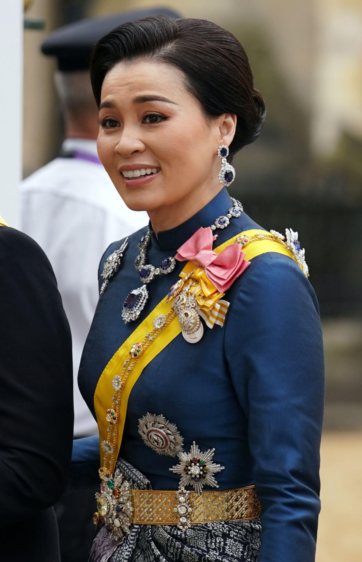 Several foreign royals from around the globe wore spectacular suites of jewelry for the coronation, but few sparkled as mightily as the sapphire and diamond jewels worn by Queen Suthida of Thailand. She dazzled in diamond and sapphire earrings and a coordinating necklace, plus a pair of gorgeous brooches. Her decorations were blazing with even more gemstones, too!