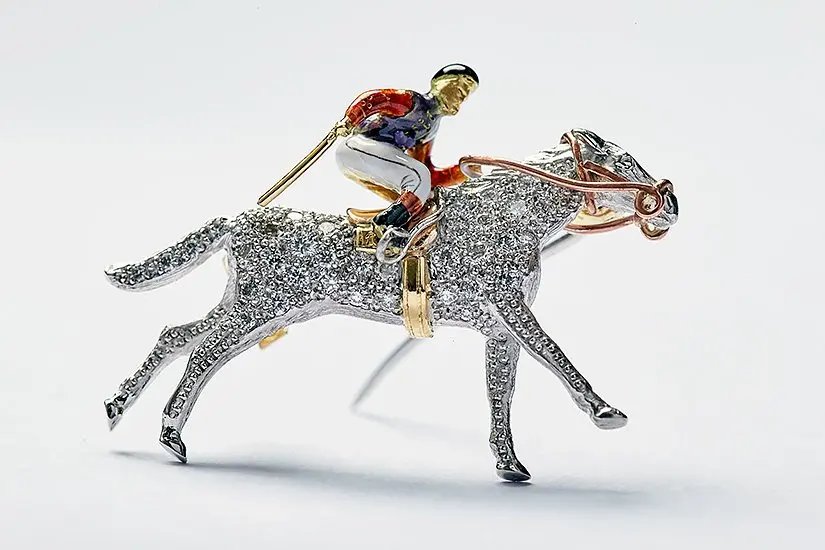 In 2016, the year she celebrated her 90th birthday, Elizabeth received a special racing-themed brooch as a birthday gift from the Racing Post. The brooch was made by the British jewelry company Alabaster & Wilson Ltd. The artists at the firm used three shades of gold–white for the horse, yellow for the jockey, and pink for the bridle–and 35 diamonds in the making of the piece. Enamel was also used to decorate the rider, who was modeled on the famous Victorian jockey Fred Archer. The jockey even wears the Queen’s red and purple racing silks.