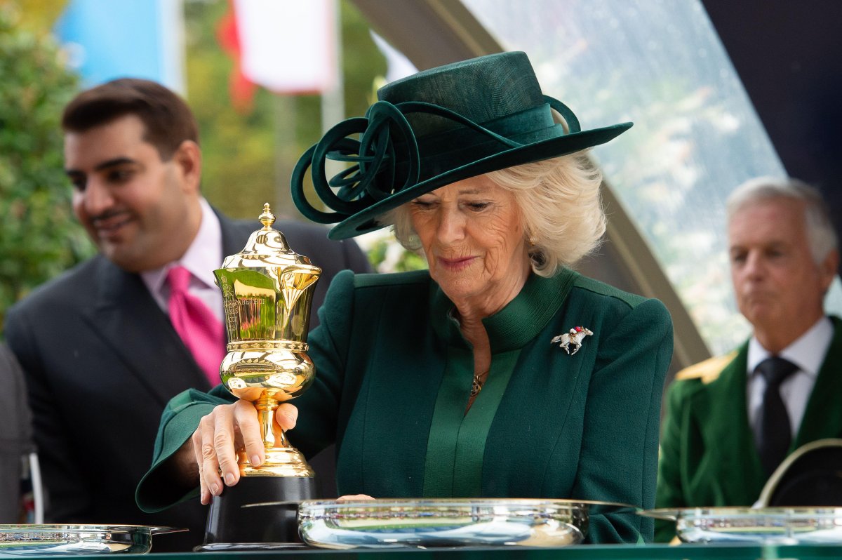 A second, similar brooch, featuring a horse in a different part of its stride, has been worn by Queen Camilla since the late Queen’s passing. Above, Camilla wears the brooch for British Champions Day at Ascot last October.