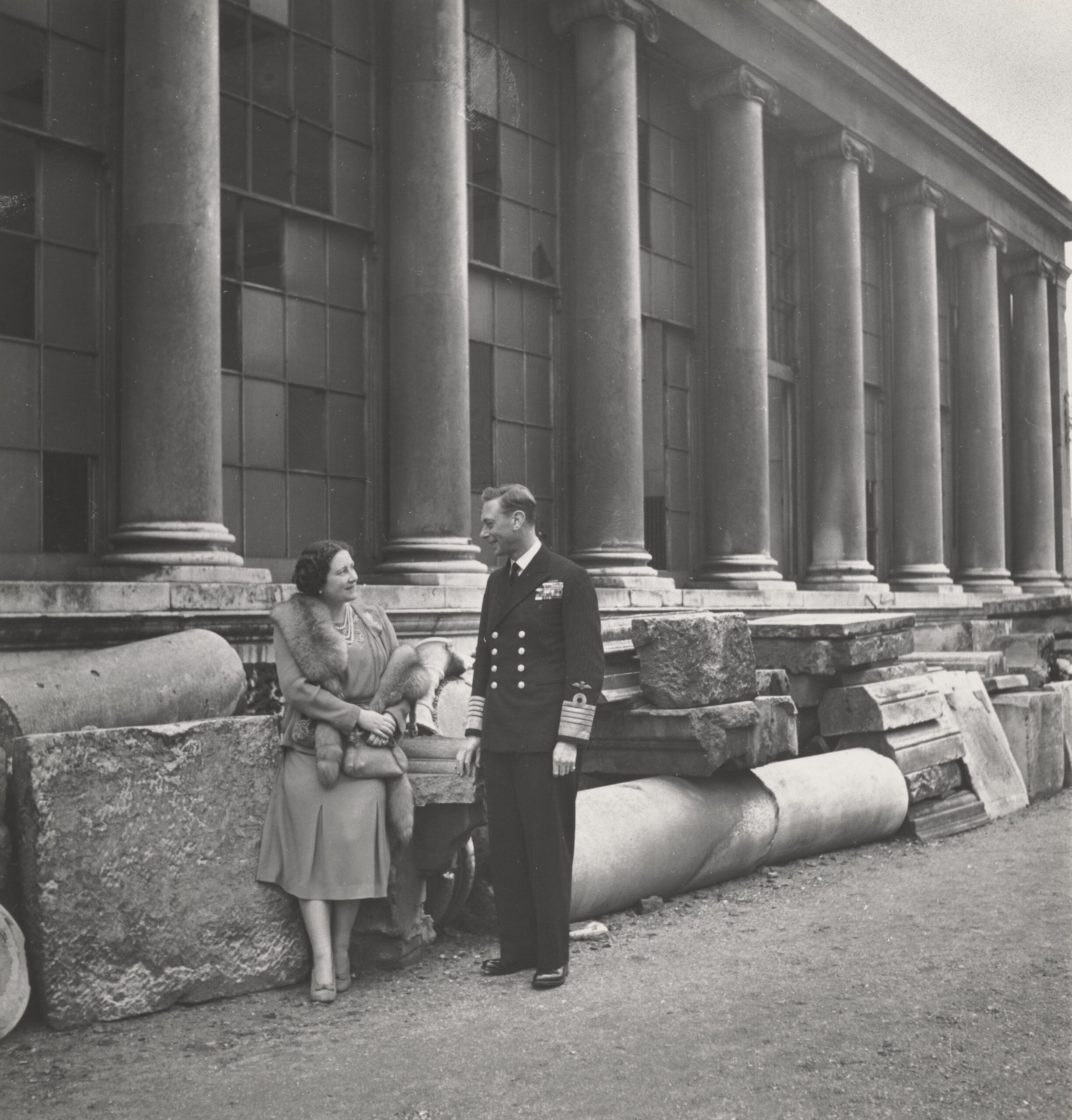 A year later, everything had changed. Now in the midst of World War II, the royal family didn’t escape the terror of the Blitz. Beaton photographed the King and Queen together as they inspected bombing damage at Buckingham Palace. Instead of a grand tiara and a floaty Hartnell gown, Elizabeth now wears a sturdier jacket and skirt. But she still always added a bejeweled touch. This time, it’s pearls and her Cartier Palm Leaf Brooch.