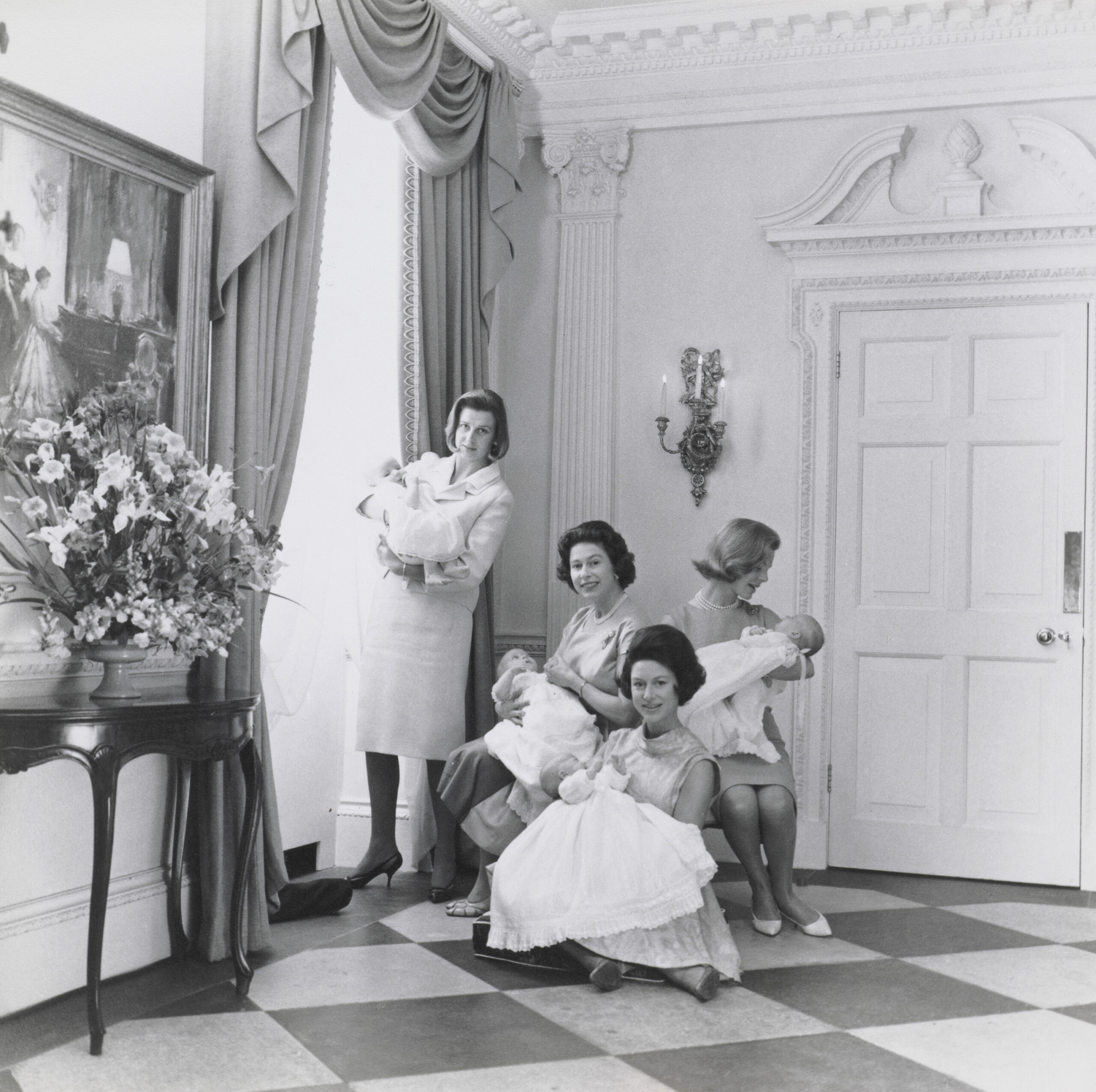 The four new royal babies are pictured with their mothers: James Ogilvy (Princess Alexandra), Prince Edward (Queen Elizabeth II), Lady Helen Windsor (the Duchess of Kent), and Lady Sarah Armstrong-Jones (Princess Margaret). In the picture, both the Queen and the Duchess of Kent wear pearls and brooches. The Queen appears to be wearing her Modern Ruby and Diamond Spray Brooch.