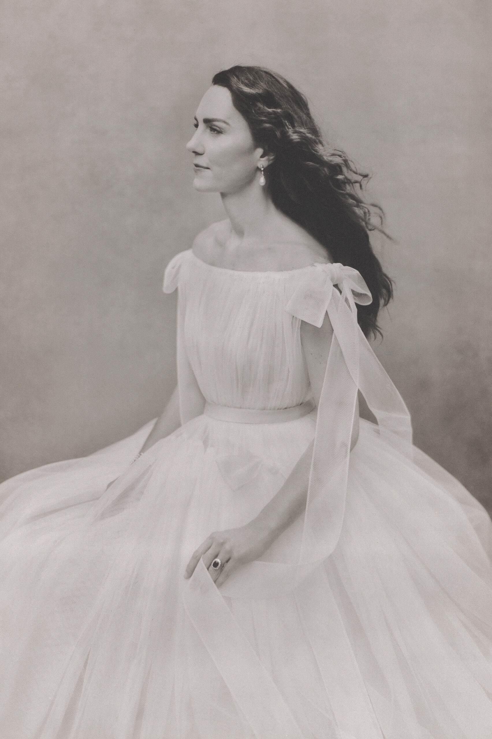 One of the newest photographs featured in the exhibition is Paolo Roversi’s 2021 picture of the Princess of Wales (then Duchess of Cambridge), taken to mark her 40th birthday. It’s one of a series of three images published from the portrait session. This ethereal picture, inspired by Victorian photographs and paintings, shows Catherine wearing the Collingwood Pearl Drop Earrings and the Nigel Milne Pearl Bracelet with her iconic diamond and sapphire engagement ring.