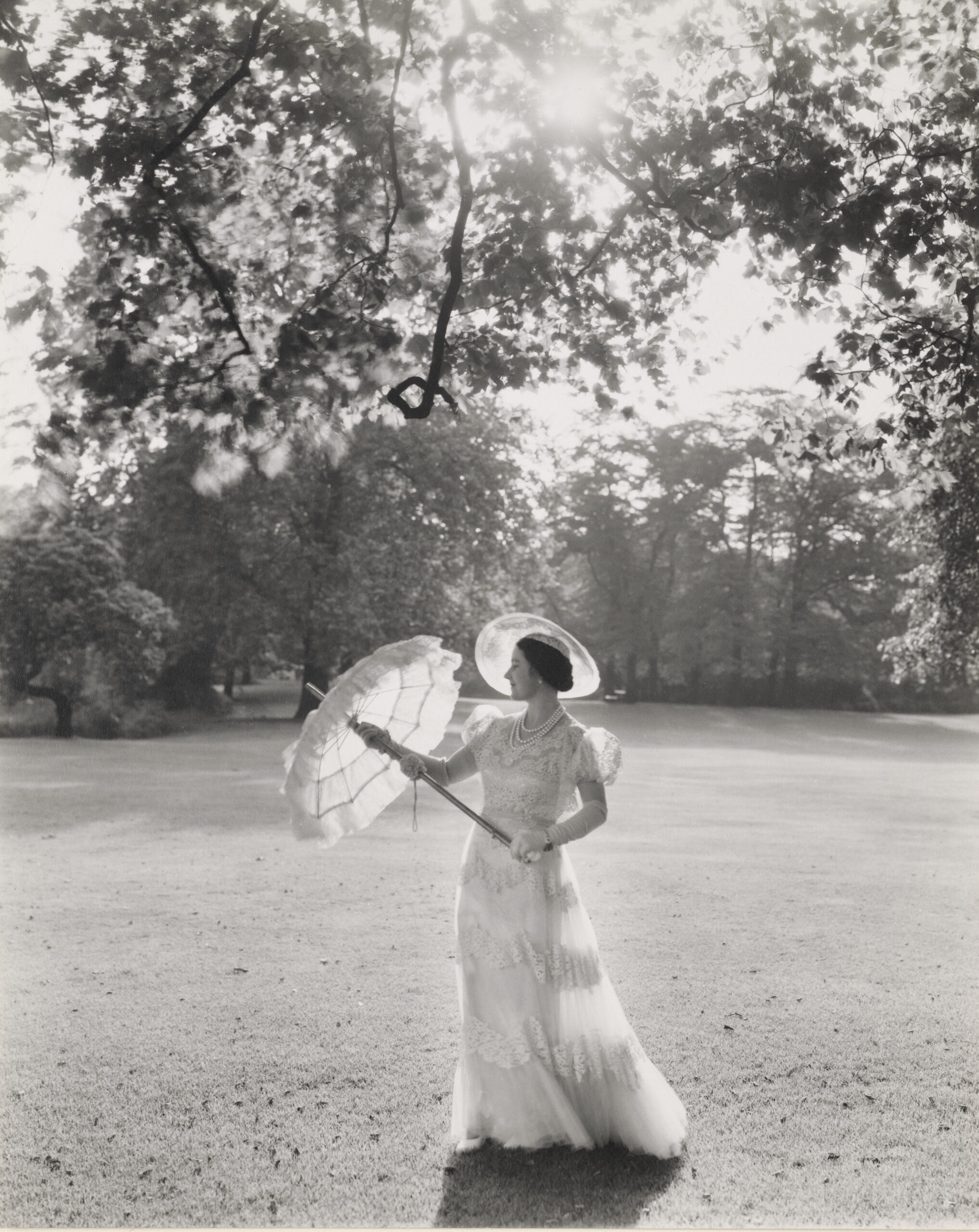 As we discussed over at Hidden Gems, the summer exhibition features a whole lot of fascinating photographs from the late Queen Mother’s collaborations with Cecil Beaton and Sir Normal Hartnell. Queen Elizabeth wears one of her Hartnell “white wardrobe” gowns with pearls in this picture, taken in the gardens at Buckingham Palace in 1939.