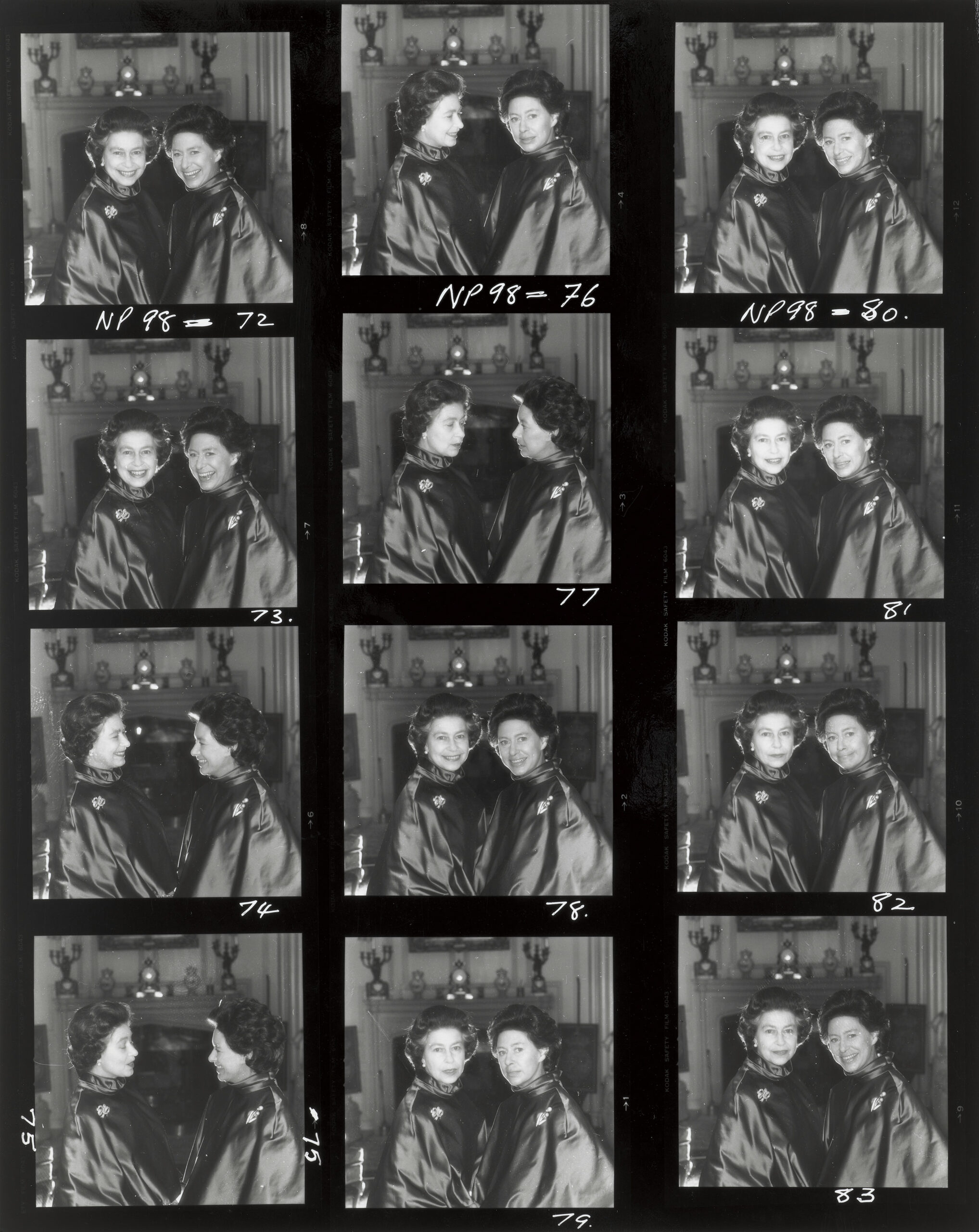 Other photographers also got the chance to take portraits of the Queen and her family members in the last decades of the twentieth century. The exhibition includes this call sheet from a famous portrait session with the Queen and Princess Margaret sitting for Norman Parkinson. The Queen Mother is also featured in some pictures from the session, which featured the royal ladies wearing bright blue fabric drapes with red edging. In these proofs, both Elizabeth and Margaret are wearing brooches. Margaret wears a pearl and diamond spray brooch, later sold at Christie’s, while Elizabeth wears one of Queen Victoria’s Diamond Bow Brooches.