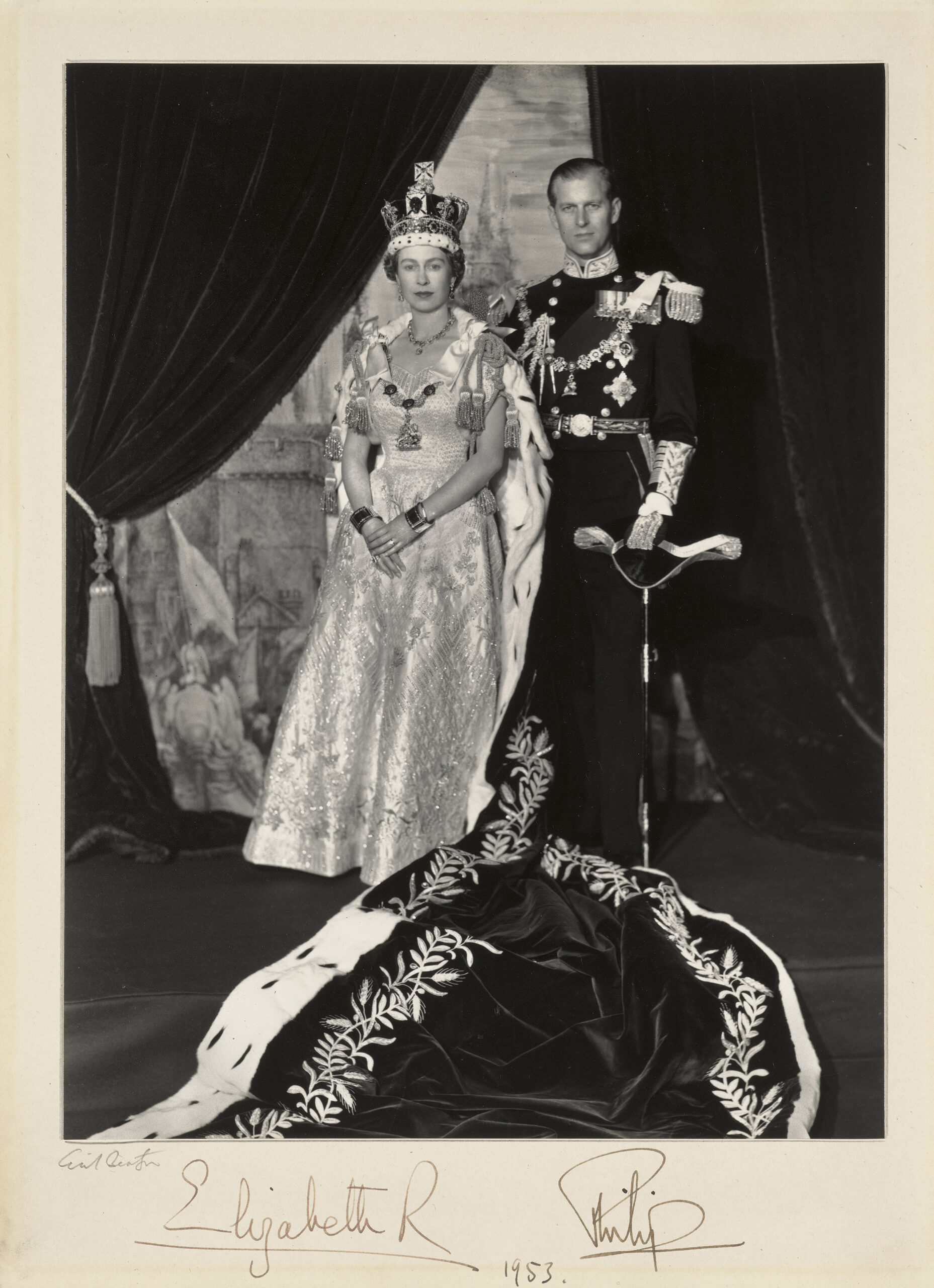 Cecil Beaton took the official pictures at Elizabeth’s coronation in 1953, including this iconic portrait of the Queen and the Duke of Edinburgh. In the image, Elizabeth wears her coronation gown and robes with the Imperial State Crown, the Coronation Necklace and Earrings, the Armills, and the Coronation Ring. The signed print shown here was sent to Queen Elizabeth the Queen Mother.