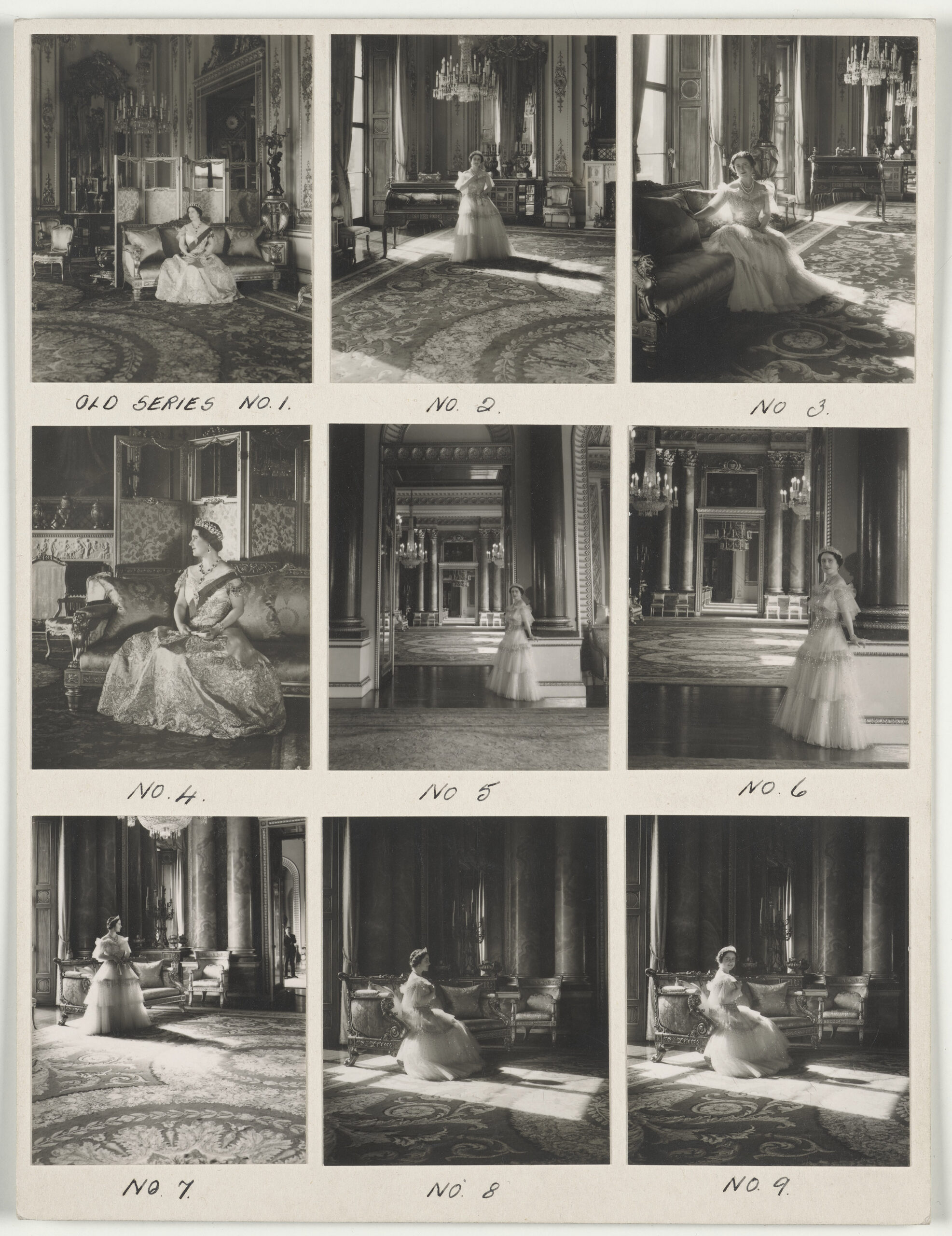 The exhibition includes several contact sheets of proofs from different portrait session. These images, also taken by Cecil Beaton at Buckingham Palace in 1939, show Queen Elizabeth in several grand evening gowns with gala jewels. Among the jewelry pieces pictured are Queen Victoria’s Indian Circlet and the Crown Rubies, Queen Mary’s Diamond Fringe Tiara, the Coronation Necklace and Earrings, Queen Elizabeth’s Coronation Necklace, and Queen Victoria’s Diamond Fringe Brooch.