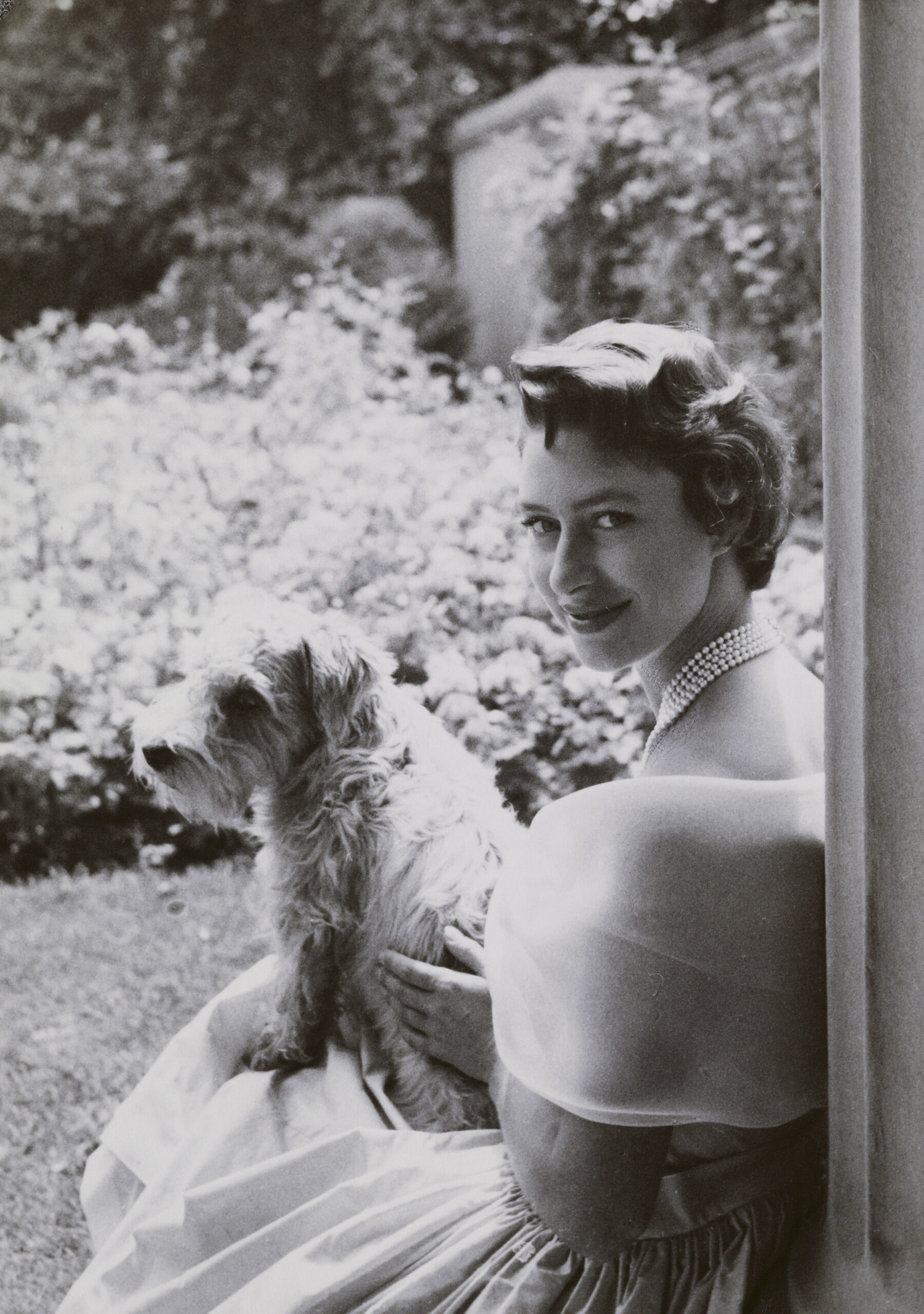 In contrast to the splendor of the official coronation portraits, the exhibition also showcases this more intimate image from Princess Margaret’s collection. The photograph was taken by Beaton in 1955 to celebrate Margaret’s 25th birthday. Her dog, Pippin, sits in her lap, and the magnificent five-stranded pearl necklace makes another appearance as well. The birthday was a pivotal one for Margaret: she had reached an age when she could marry without the consent of the sovereign. But just a few months after her birthday, she announced to the world that she had decided not to marry the divorced equerry Group Captain Peter Townsend, ending years of speculation about their relationship.