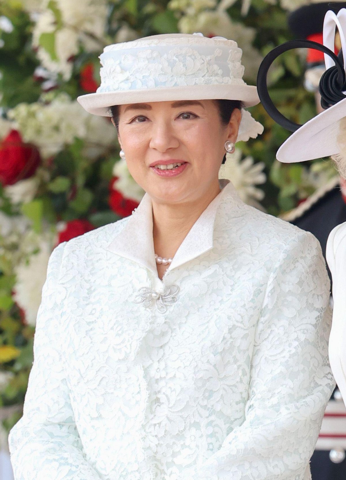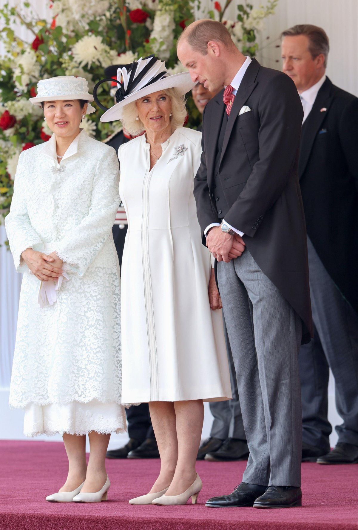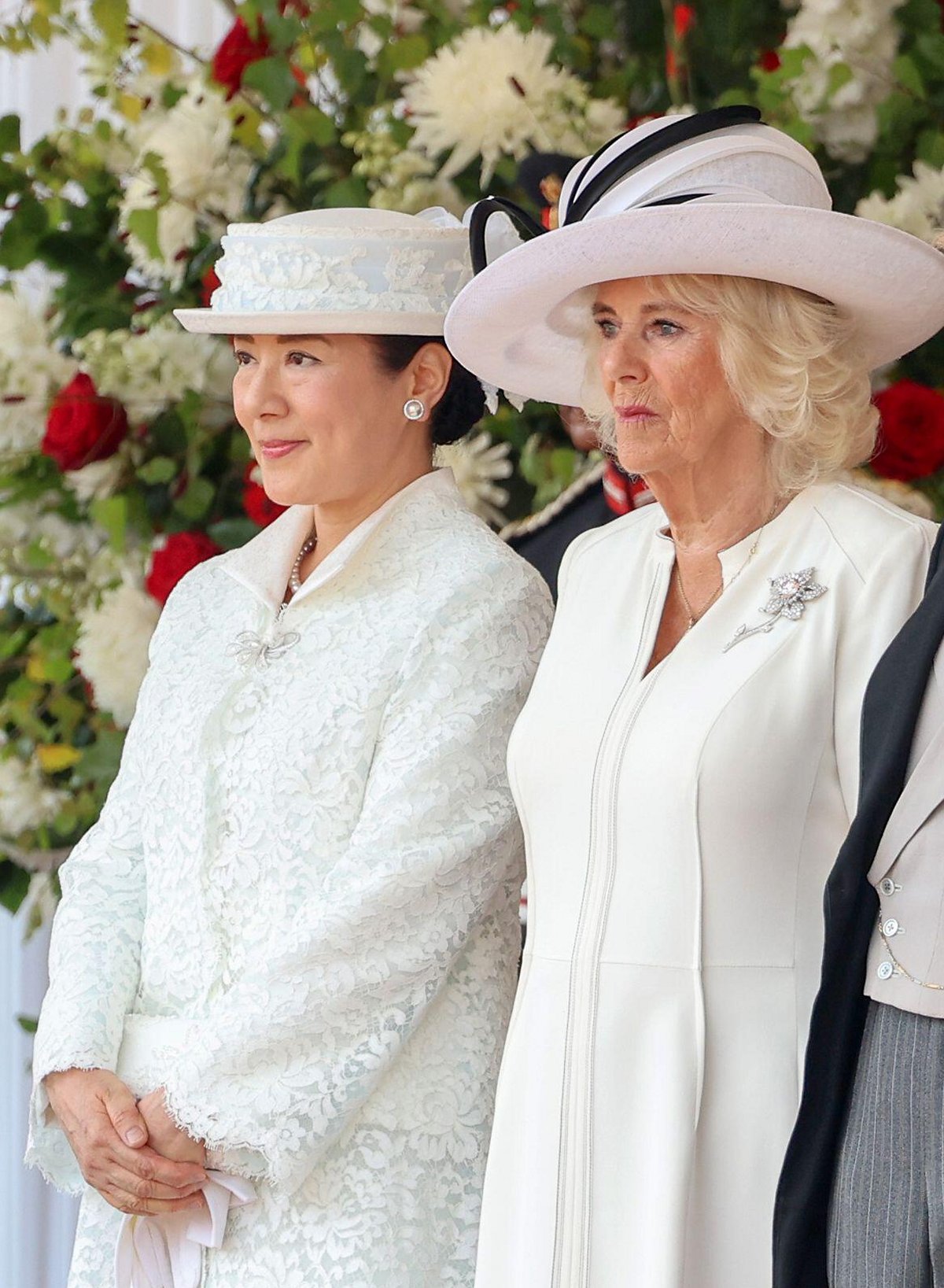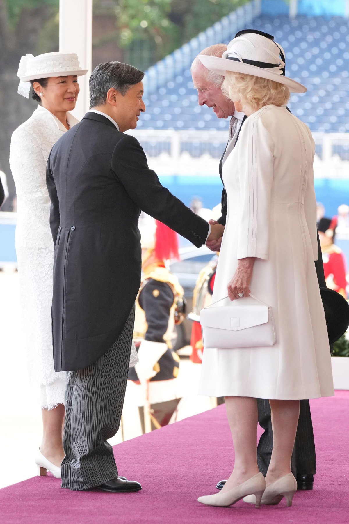 Both Masako and Camilla chose bright neutrals for the welcome ceremony. The Empress wore a lace coat with a matching dress and hat in shades of white and pale blue, while Queen Camilla wore a white ensemble with subtle black accents by Anna Valentine with a coordinating Philip Treacy hat.
