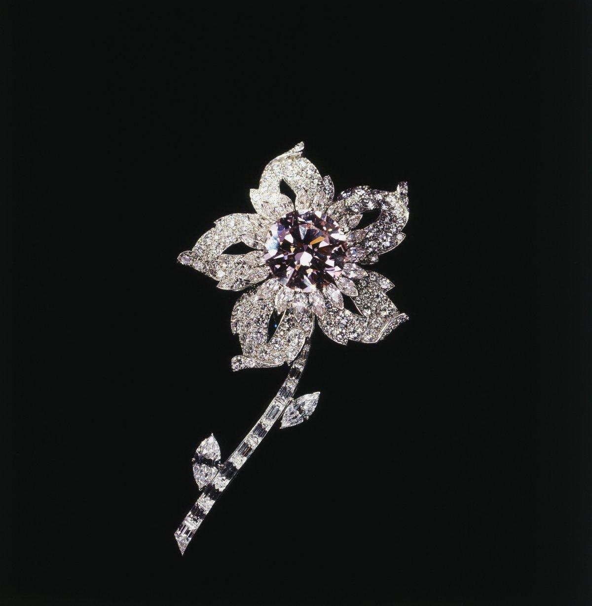 The brooch’s central pink diamond, which originally weighed in at 54.5 carats, was a wedding gift to Elizabeth from a Canadian geologist, John Thoburn Williamson, in 1947. With the guidance of Queen Mary, Elizabeth decided to have the rare pink diamond mounted as the centerpiece of a modern brooch. After cutting, the pink diamond weighed in at 23.6 carats. Frederick A. Mew of Cartier in London designed a jonquil-shaped platinum and diamond brooch to showcase the pink diamond.