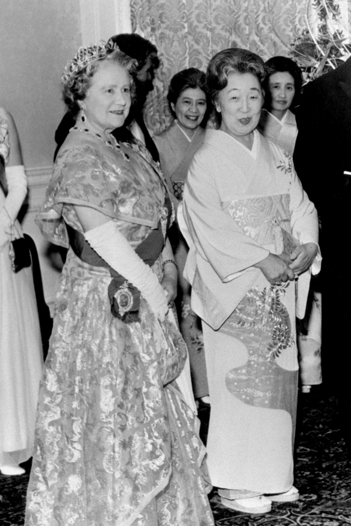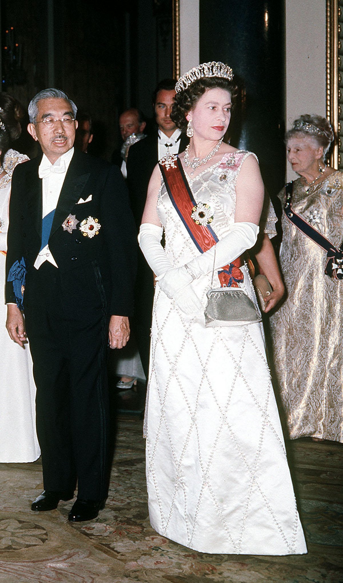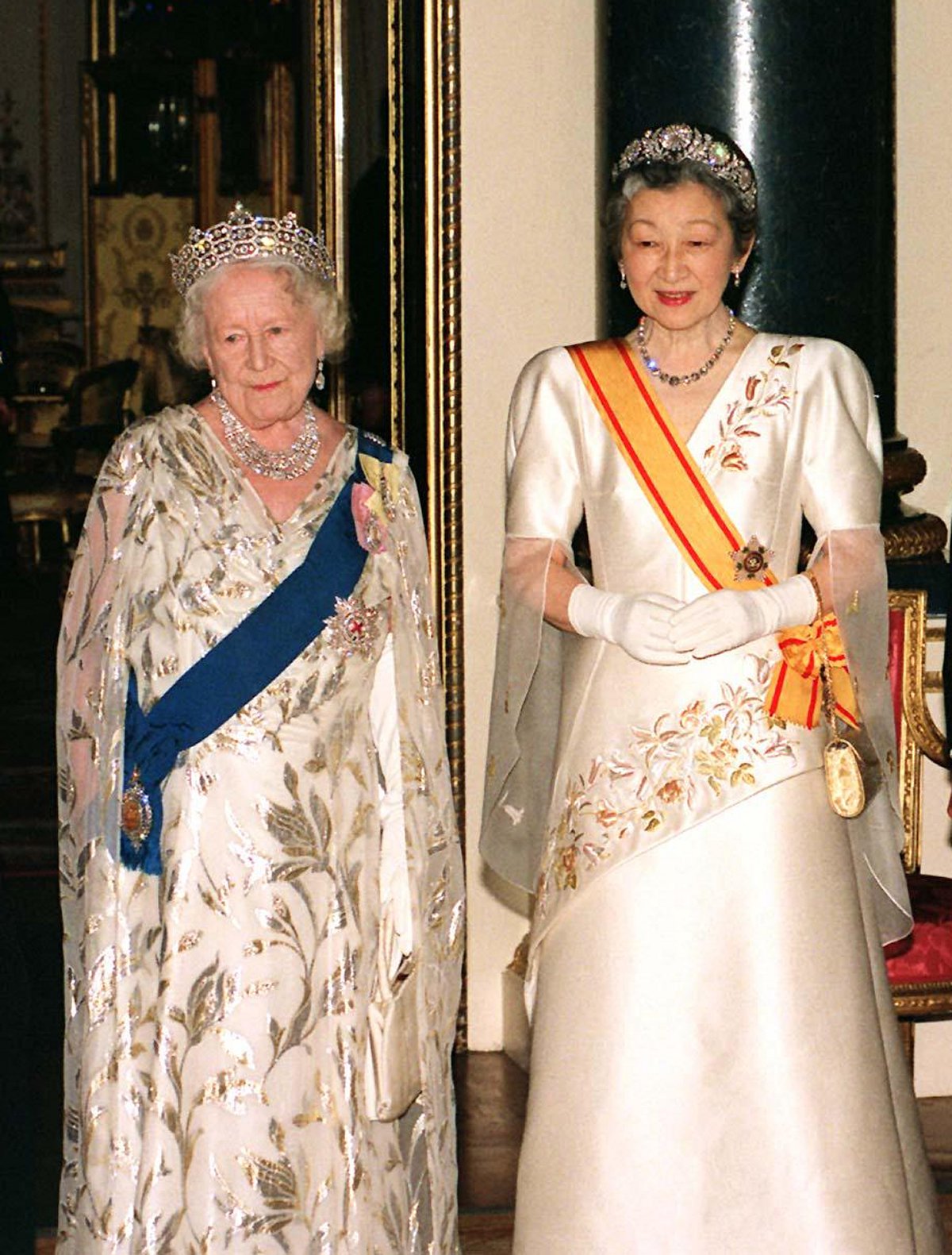 Empress Michiko, one of the most elegant royals of her generation, wore the Imperial Chrysanthemum Tiara with additional diamond ornaments. Beside her, the Queen Mother wears three jewels from the Greville Bequest: the Greville Tiara, the Greville Peardrop Earrings, and the Greville Festoon Necklace in its three-strand setting.