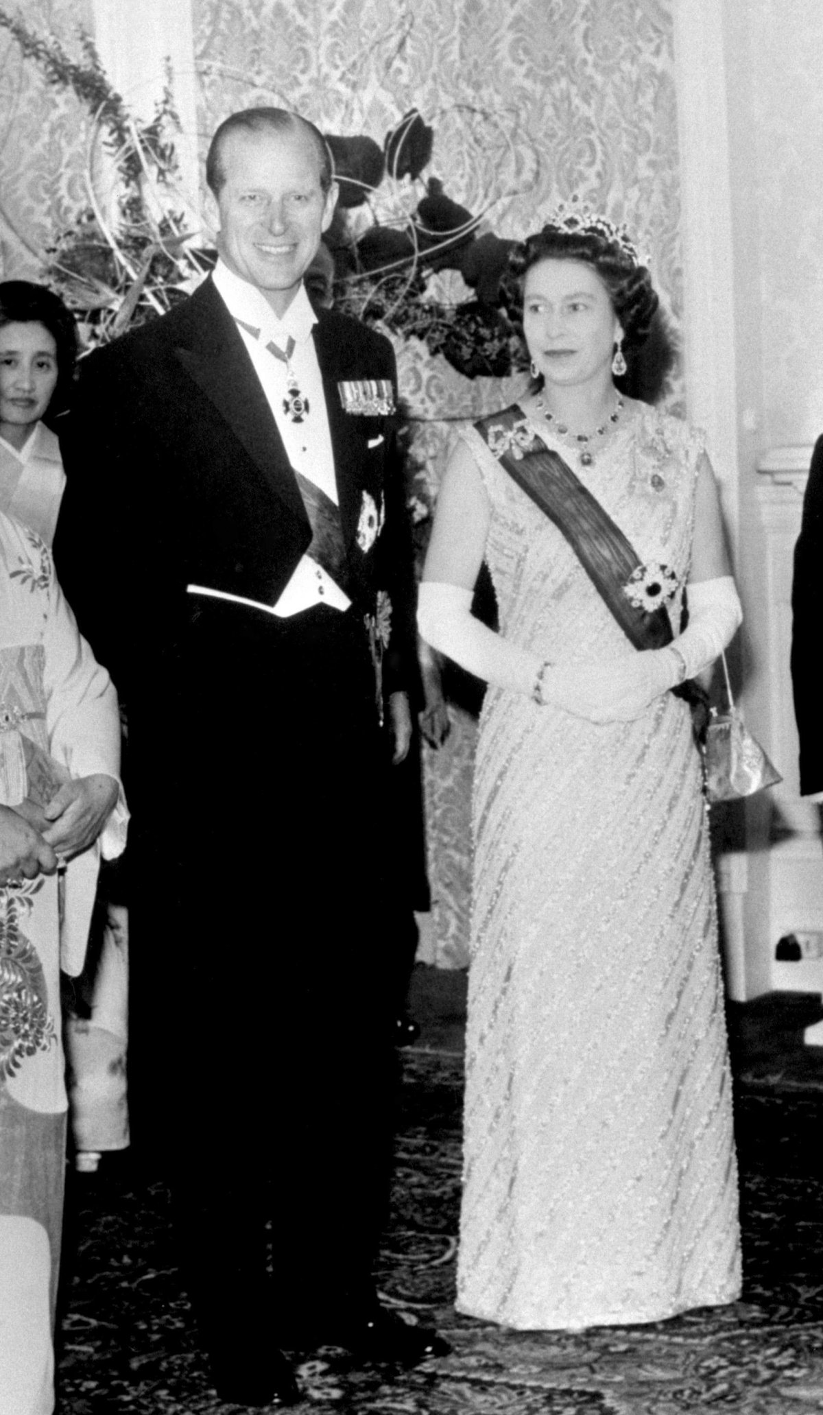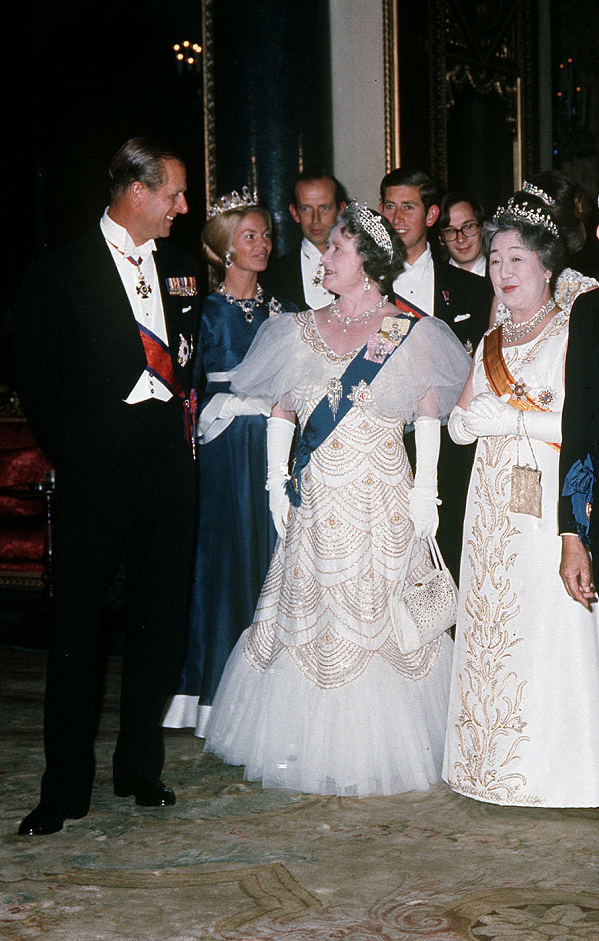 The royals wore essentially the same chivalric decorations that they (and their counterparts) had worn in 1971. The Queen and the Duke of Edinburgh wore the Order of the Chrysanthemum, while the Emperor wore the Order of the Garter (bestowed on him by the Queen earlier that afternoon) and the Empress wore the Order of the Precious Crown. The Queen Mother, as she had done thirty years before, wore the Garter as well.