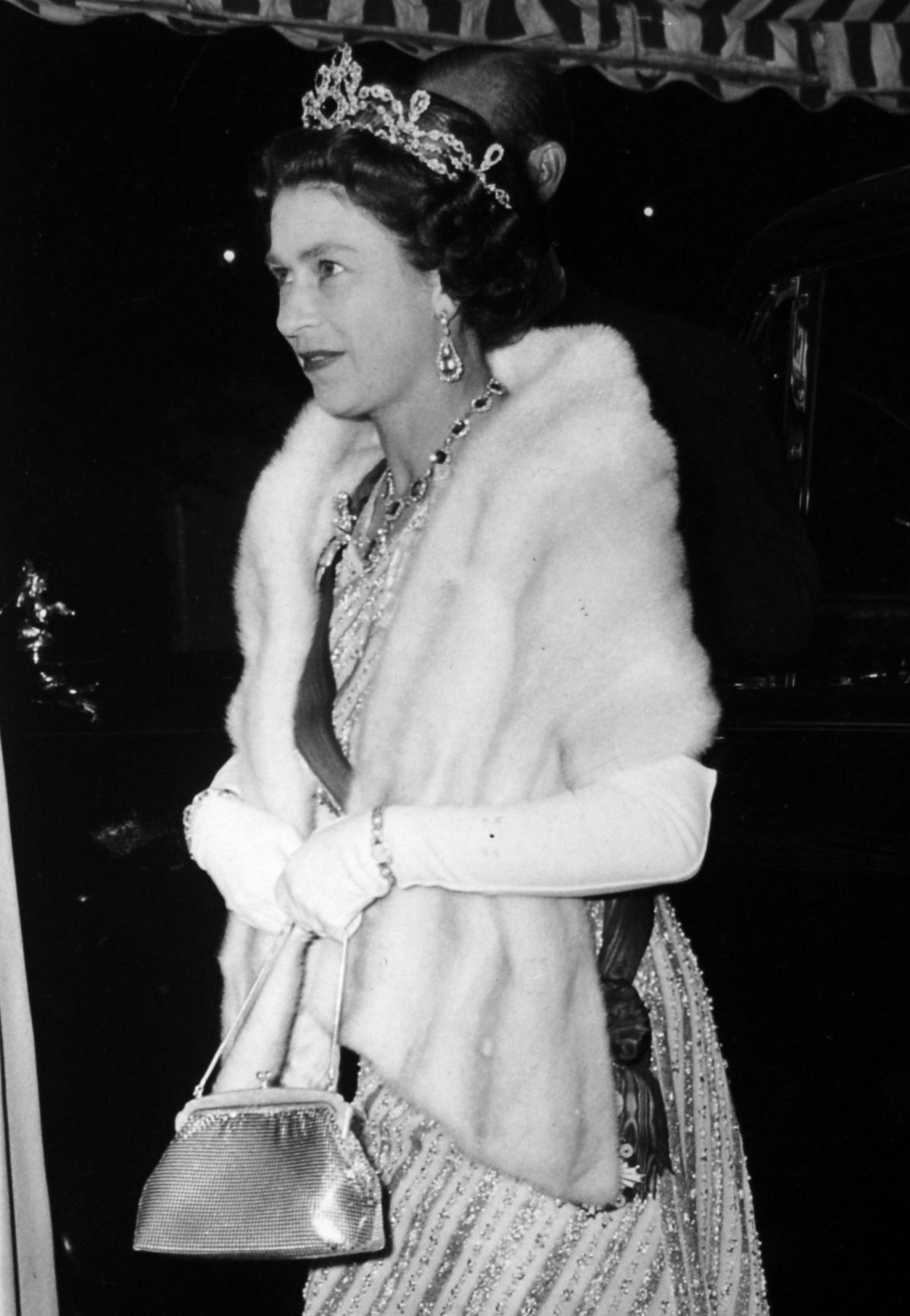 The Queen Mother wore Victorian jewels for the banquet as well. Her tiara, the Indian Circlet, was designed by Prince Albert for Queen Victoria. She paired the tiara with the coordinating Crown Ruby Necklace and Earrings, and she completed the look once again with Queen Victoria’s Fringe Brooch.