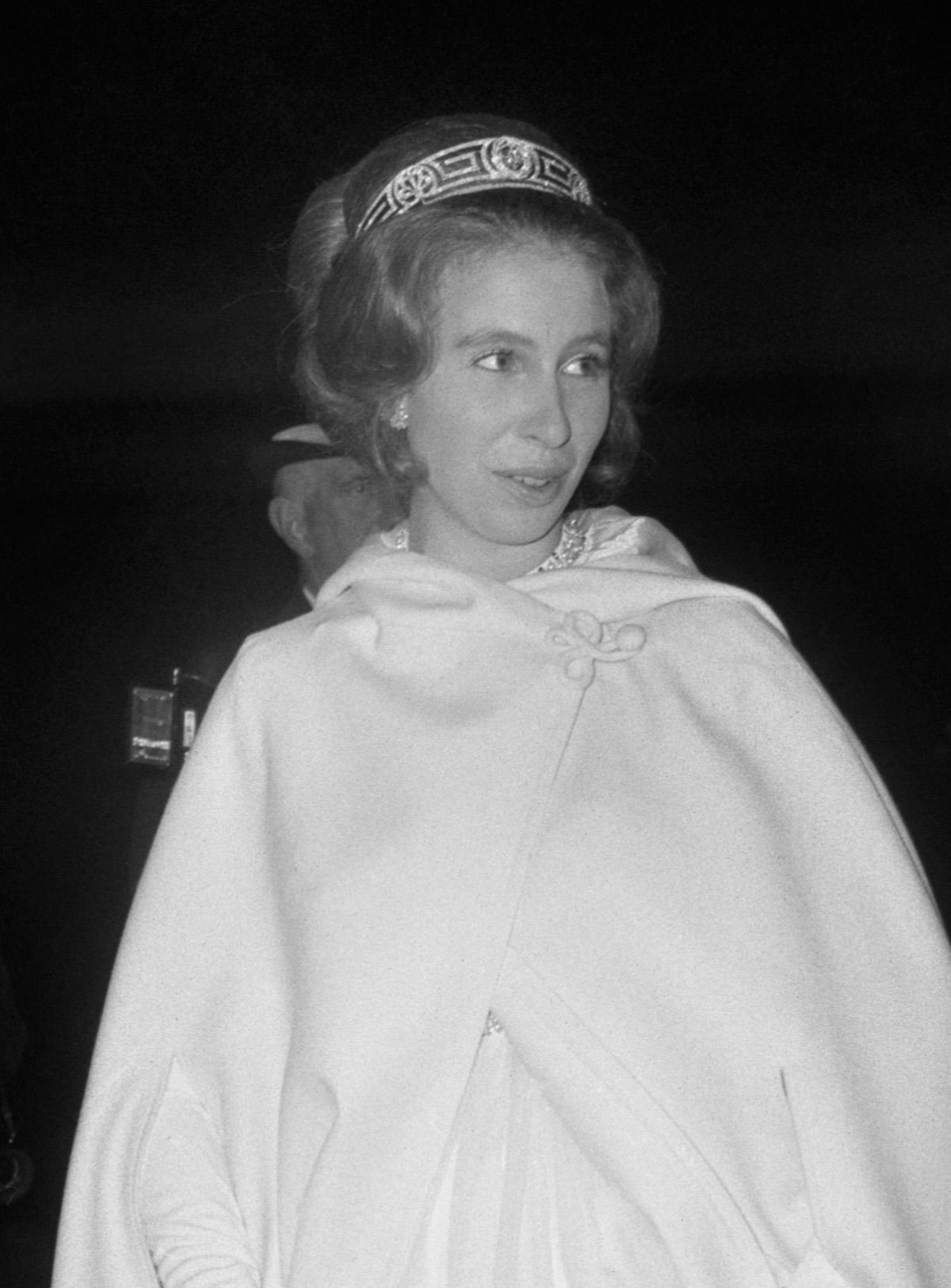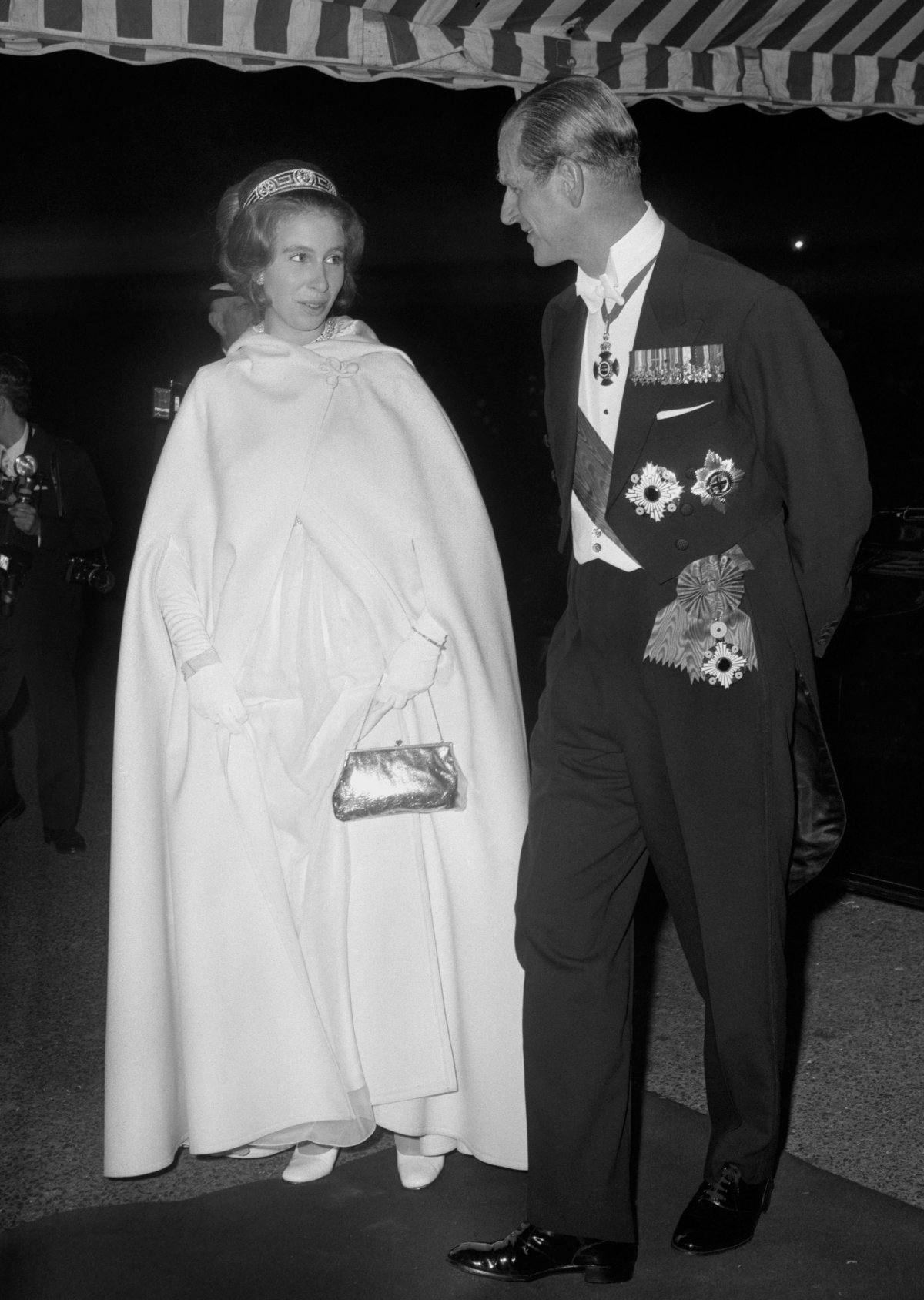 Here’s a look at Princess Anne and her father on their arrival at the embassy for the banquet. Anne wore a very dramatic evening cape to ward off the chilly October air.