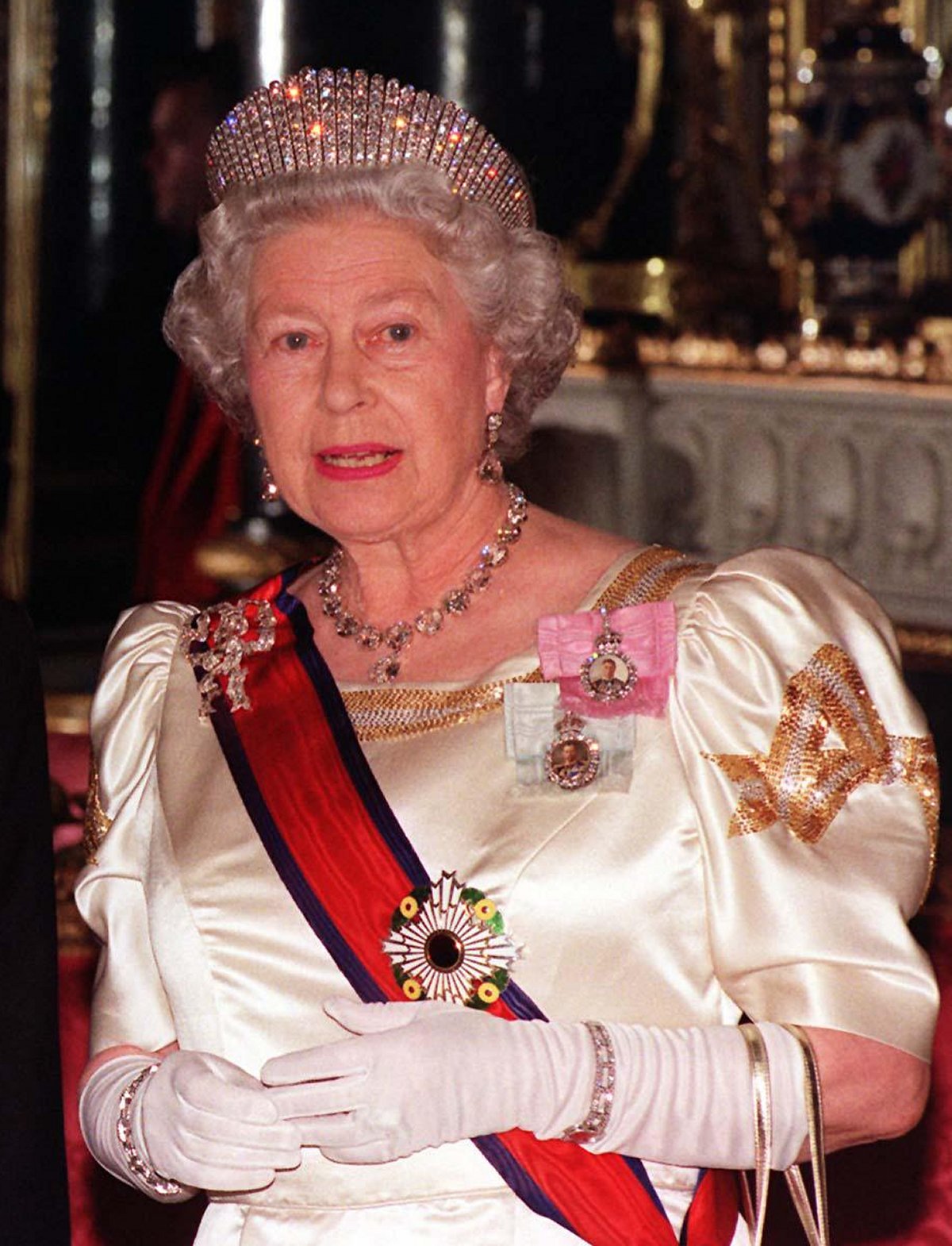 The Queen arrived wearing sparkling sapphires. She paired the Belgian Sapphire Tiara, which she had acquired herself in the 1960s, with the suite of Victorian sapphire and diamond jewelry given to her by her father, King George VI.