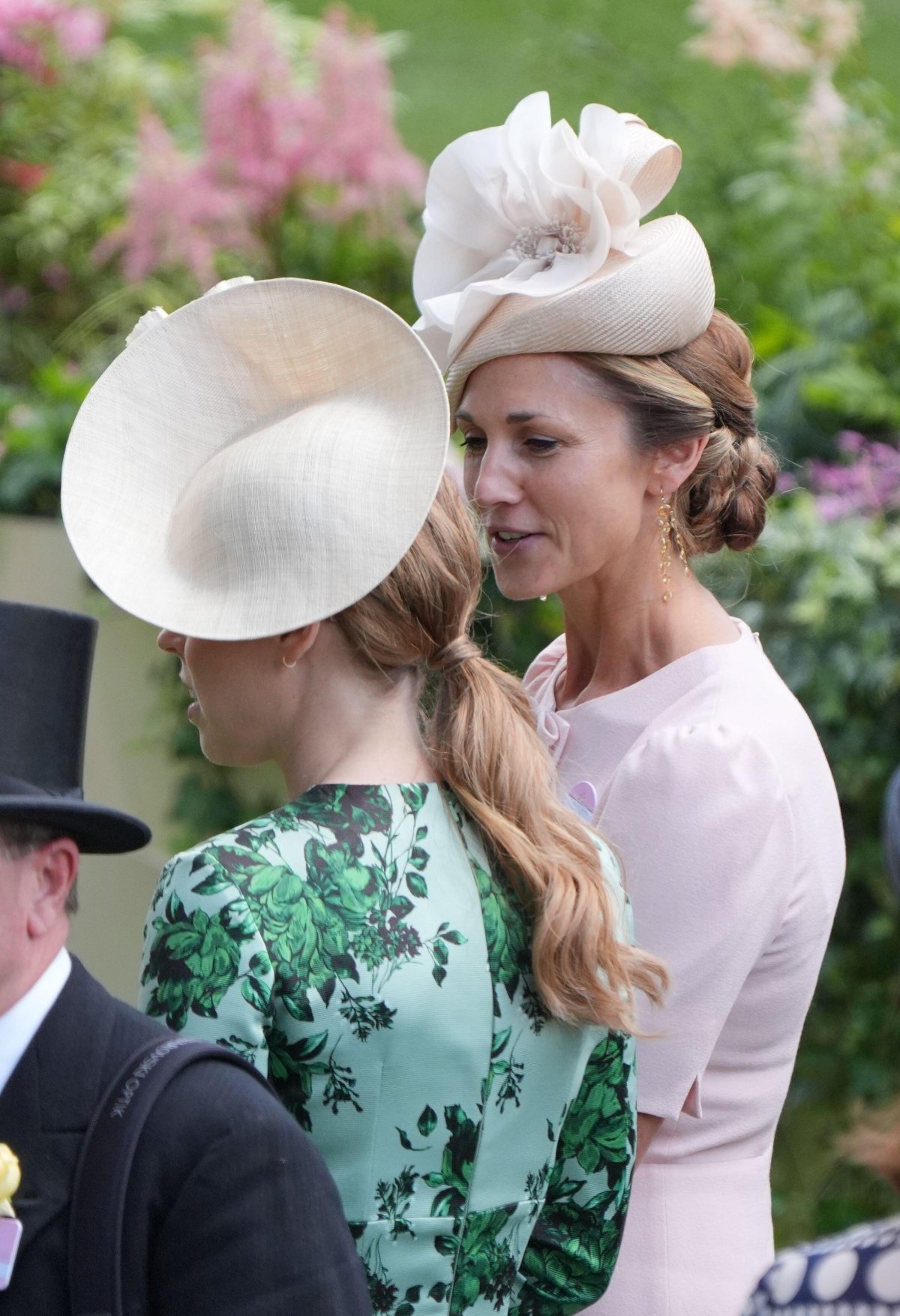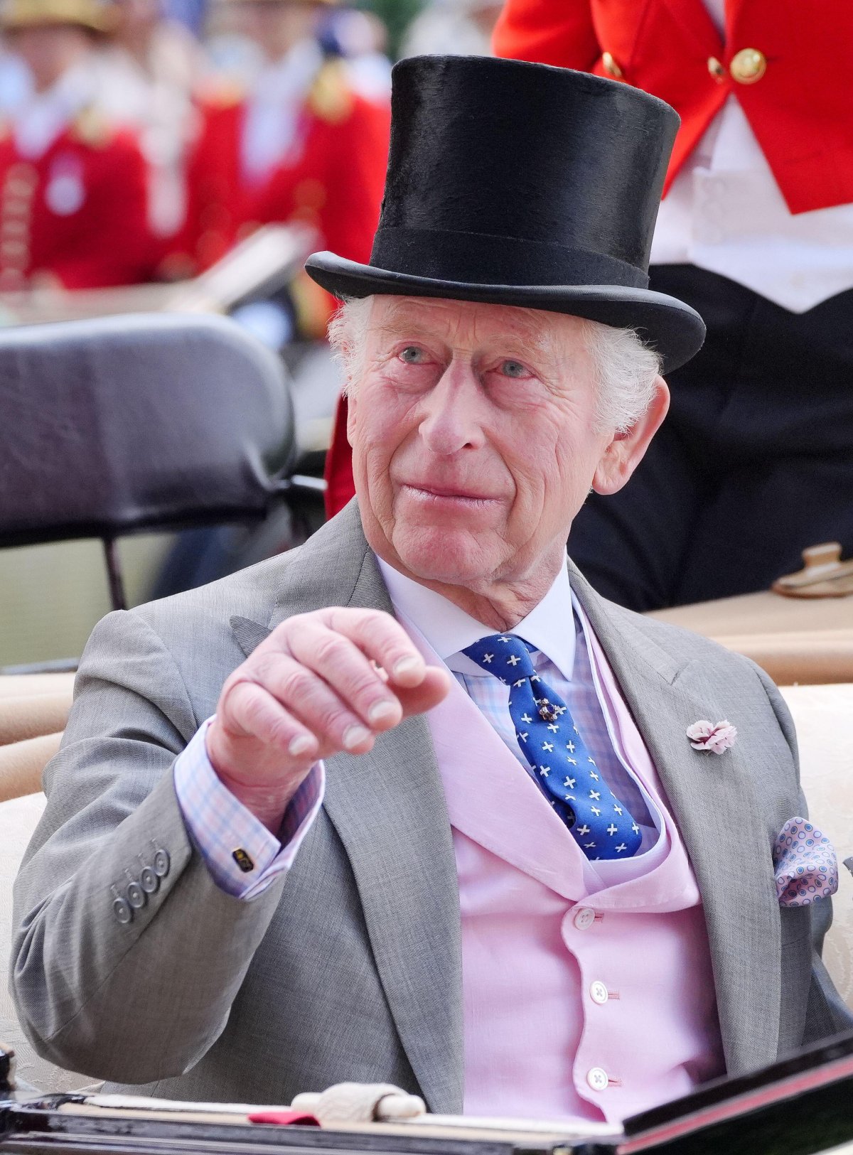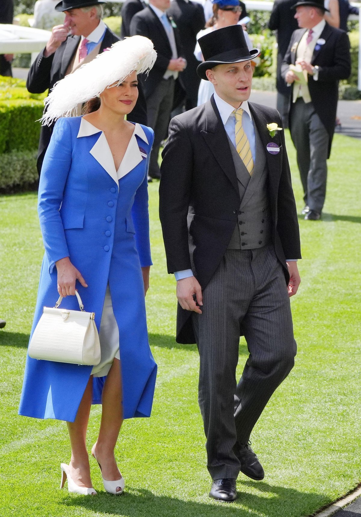 The King and Queen were once again in the lead carriage during the procession to the racecourse today. They were joined by two of their close friends, Lord and Lady Bamford, wealthy business owners who run organic farms on their country estates. The next carriage featured four members of the next generation of the royal family: Princess Beatrice with her husband, Edoardo Mapelli Mozzi, and Lord Frederick Windsor (son of Prince and Princess Michael of Kent) with his wife, the actress Sophie Winkleman.