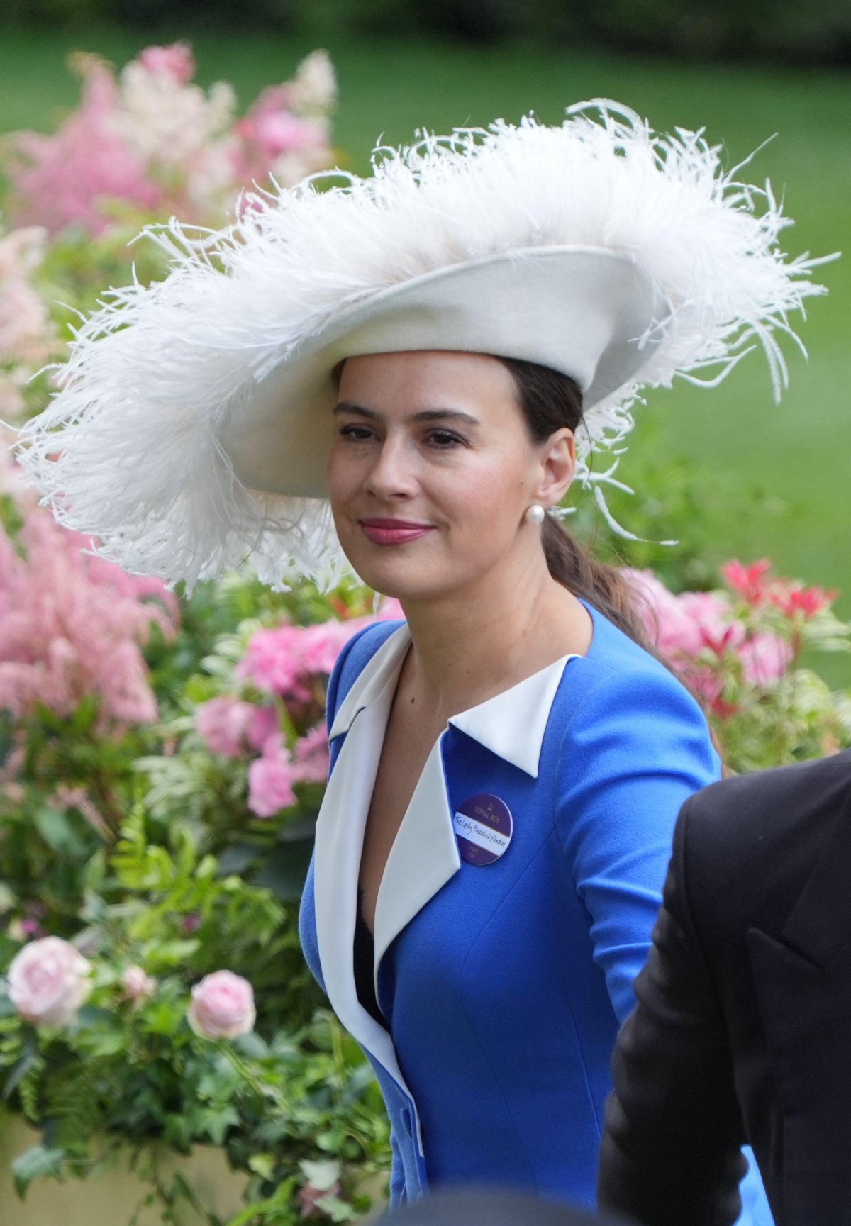 Lady Frederick Windsor opted for blue and white for her day at the races on Friday, including a dramatic feathered hat.