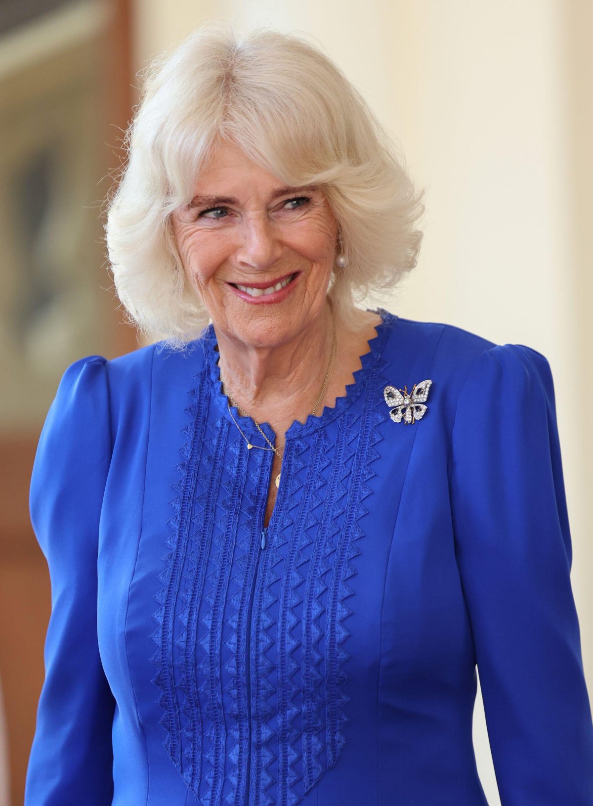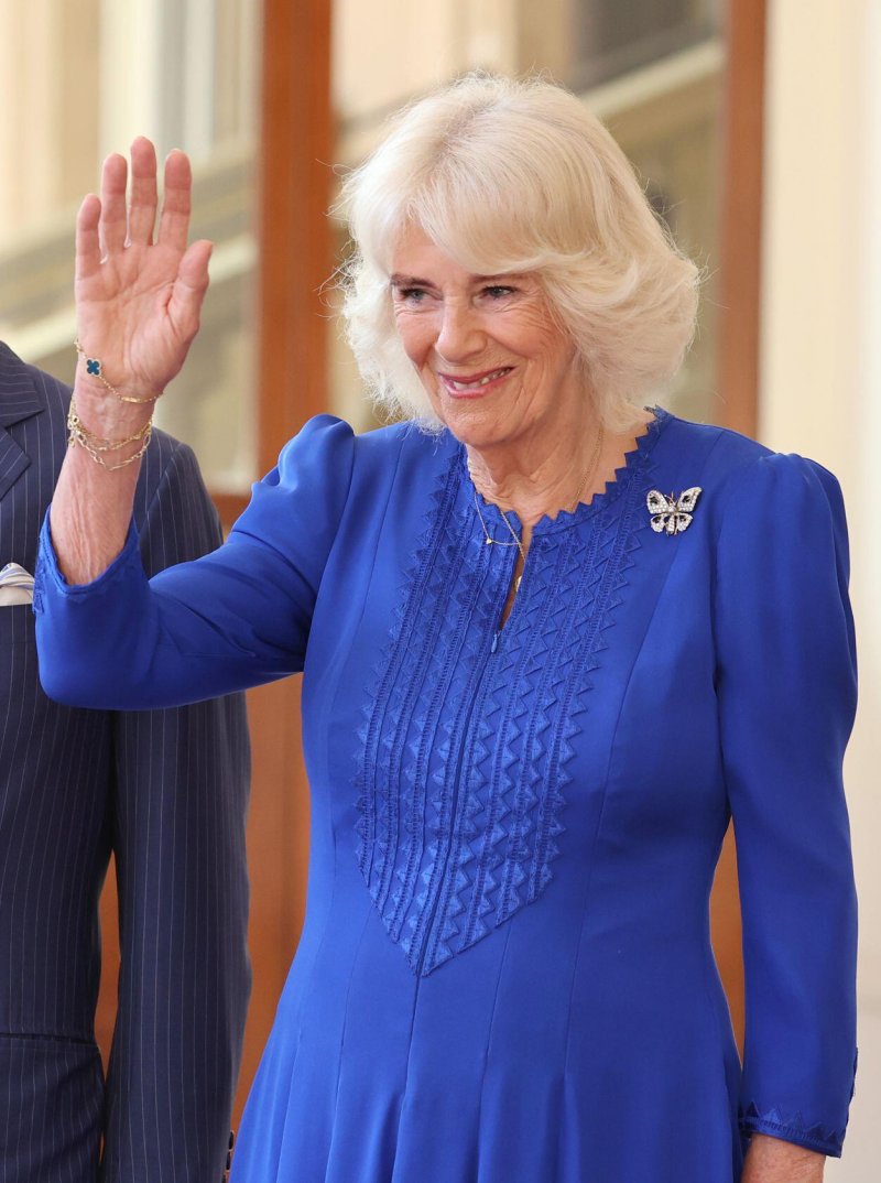 Queen Camilla wore bright royal blue for the official farewell moment outside the palace. She accessorized with pearl drop earrings, her usual casual necklaces and bracelets, and a gem-set brooch from her collection of insect-themed jewelry. (I also spot a new necklace with a teeny heart pendant, I believe.)