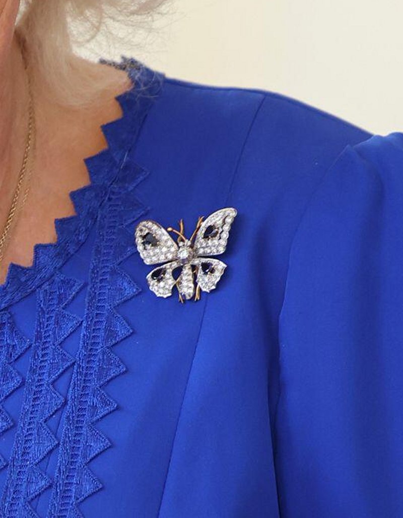Here’s a closer look at the brooch, which features diamonds and dark blue sapphires set in gold. In the past, I’ve described this brooch as representing a butterfly. I am notoriously bad at identifying insects and flowers, but the fact that Camilla chose this brooch for the final engagement of the Japanese state visit tells me that the piece is probably instead meant to resemble a moth.